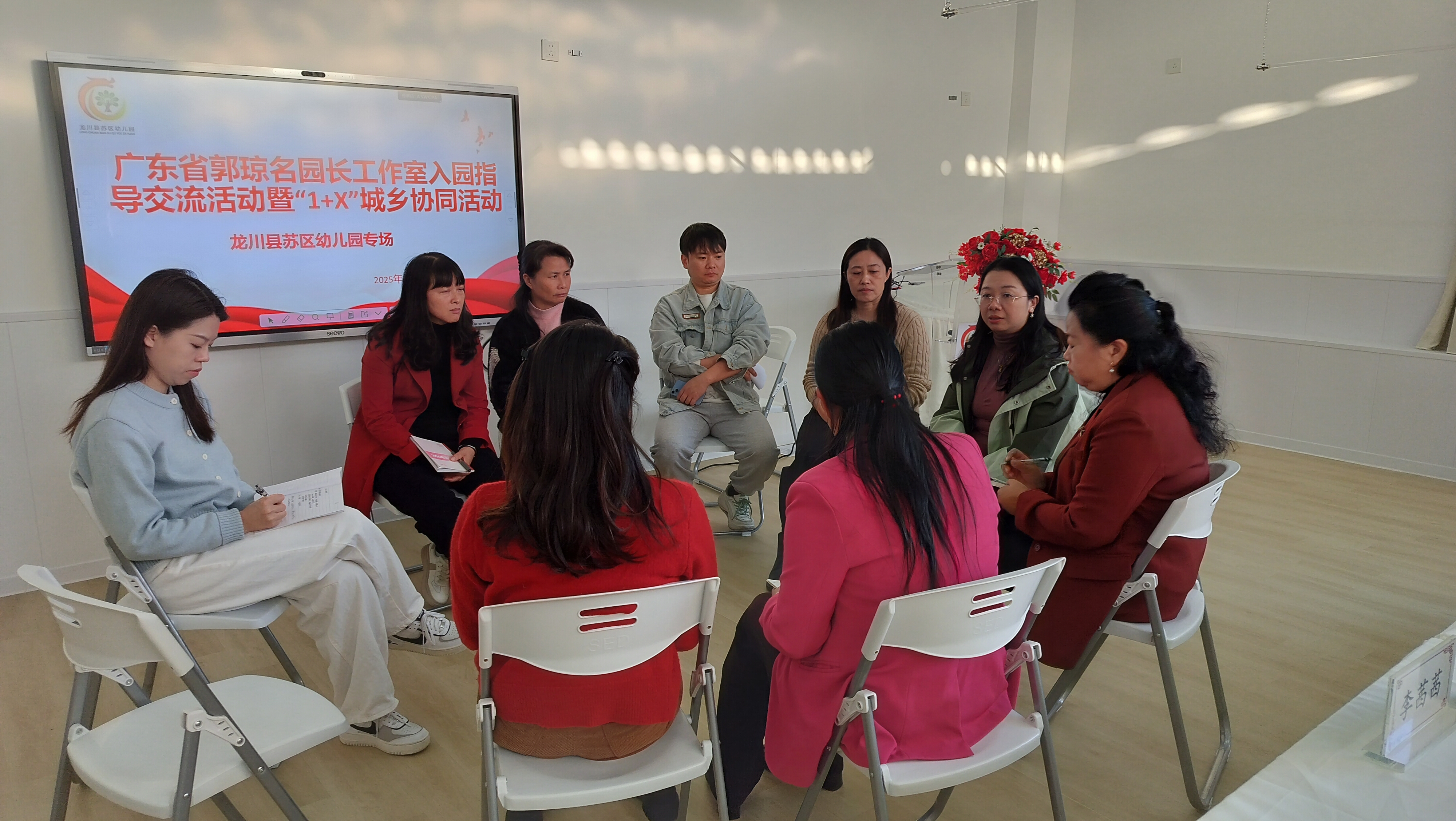 冬日暖阳映初心,幼教同行聚龙川。为深入贯彻落实教育家精神,充分发挥名园长工作室的示范引领与辐射带动作用,推动城乡学前教育优质均衡发展,近日,广东省郭琼名园长工作室团队、核心学员走进河源市龙川县,深入苏区幼儿园、水坑幼儿园,开展为期1.5天的沉浸式送教、专题研讨与精准指导活动。龙川县教师发展中心副主任刘彩云、小幼教室主任黄春明、教研员巫丽英等出席活动,城乡结对帮扶园代表参与,共同见证了一场理念引领、实践赋能的专业对话。