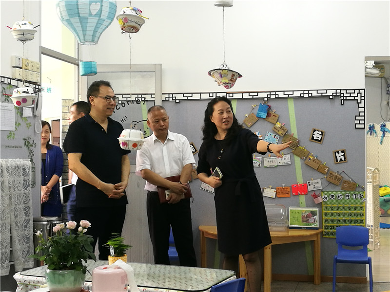 宋副区长一行巡视了幼儿园室内外环境,参观了活动区域中的材料及户外体能、游戏区域的设施设备,听取了清秀幼儿园郭琼园长的工作汇报。