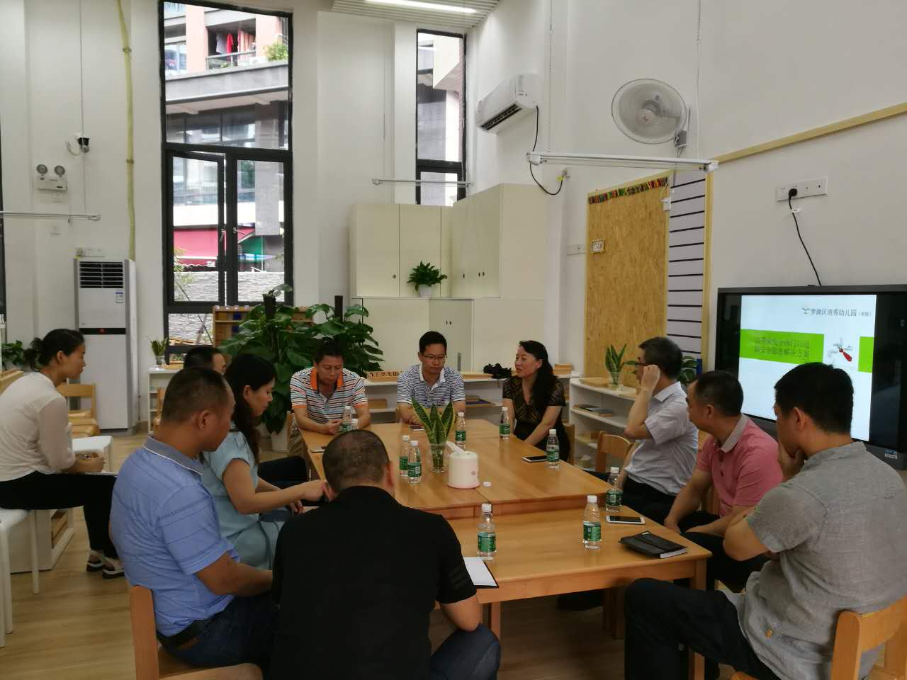看完现场后,大家就如何保证接送幼儿的安全展开展开了充分的讨论,郭琼园长详细介绍了现场的情况,从幼儿安全以及客观实际因素考虑,提出三种解决方案。大家充分论证了三种方案的可行性,最后一致决定采取第一方案,即:在幼儿园接送学生时段,将合正荣悦小区的车道改为单向出车的单车道,做到人车分流,交警、管理处、幼儿园三方各司其职,以保证幼儿及家长的出入安全,同时保证小区的进出车辆不受太大影响。