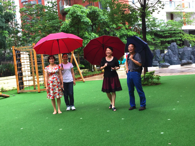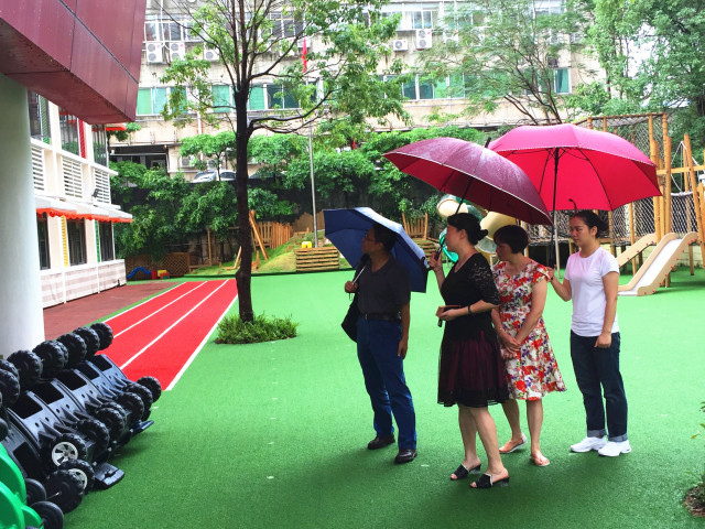 尽管天空下着雨,但刘老师依旧细致的参观了我园的户外场地和环境。