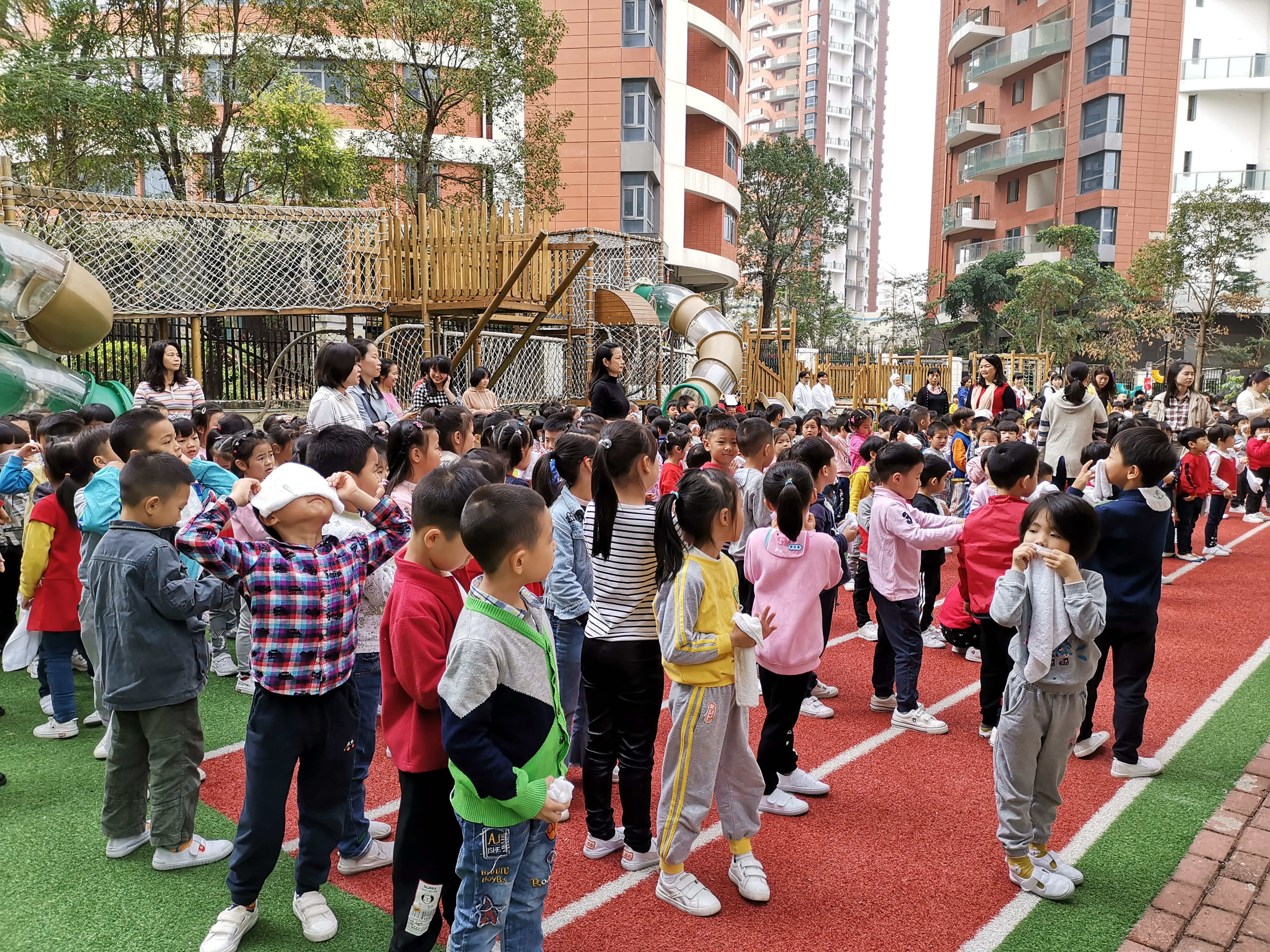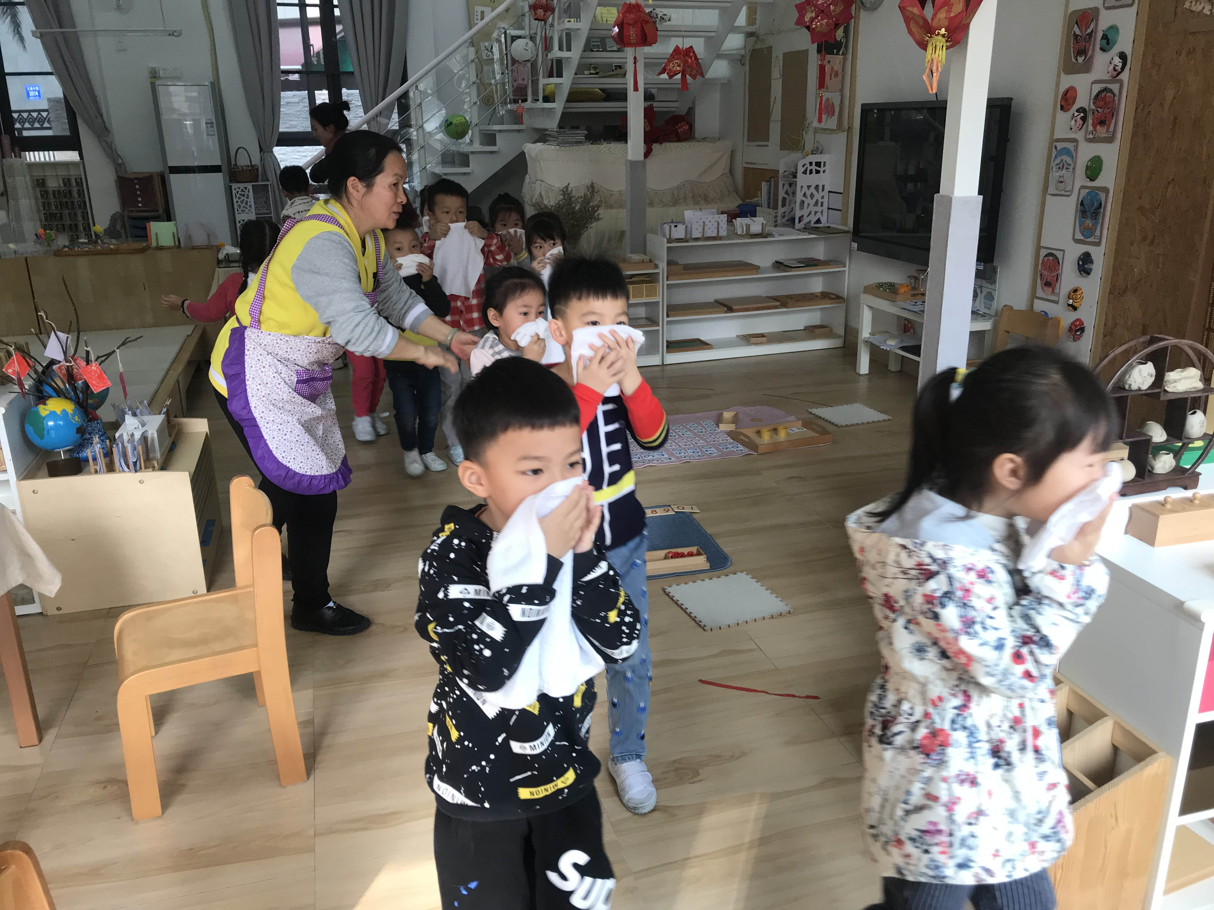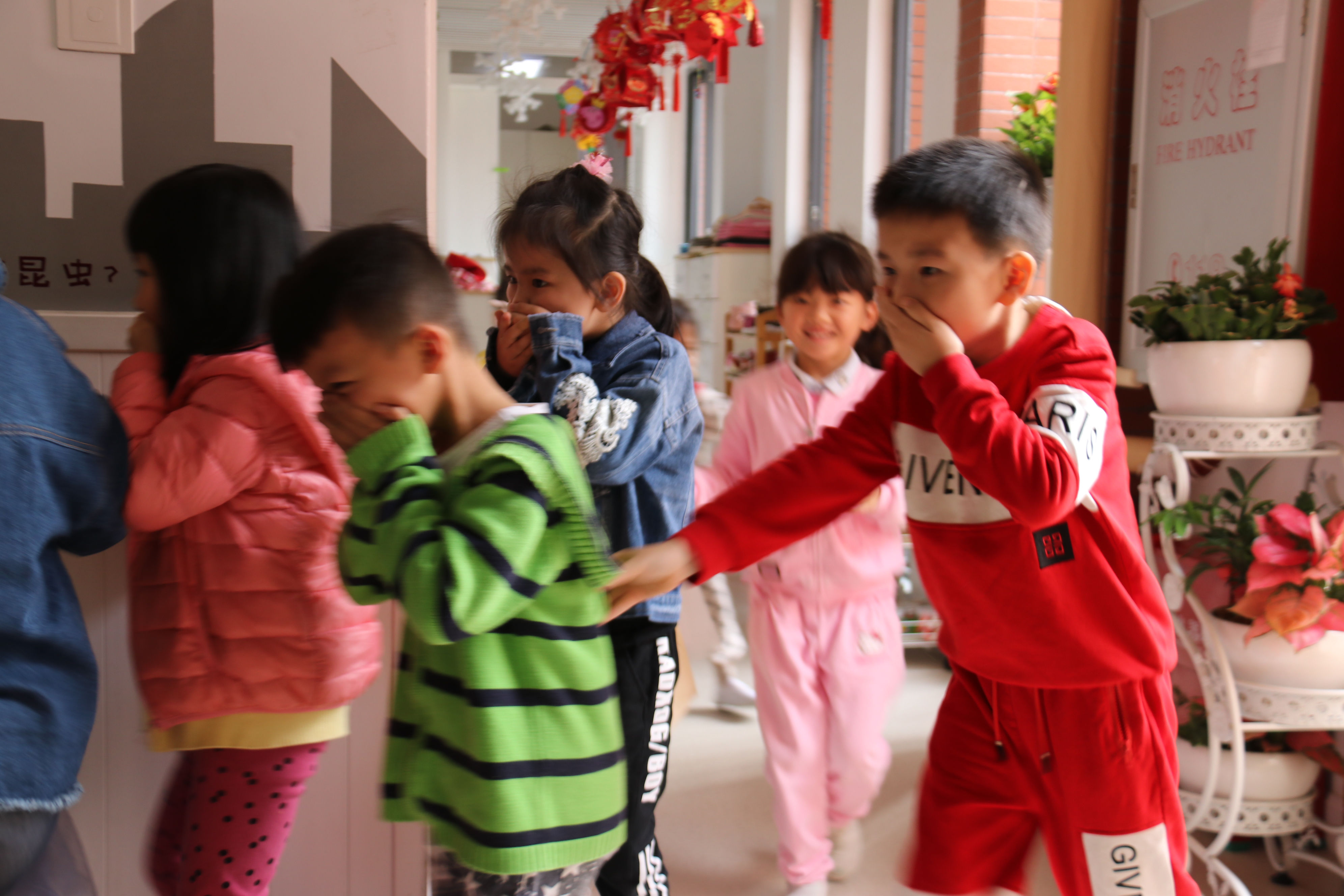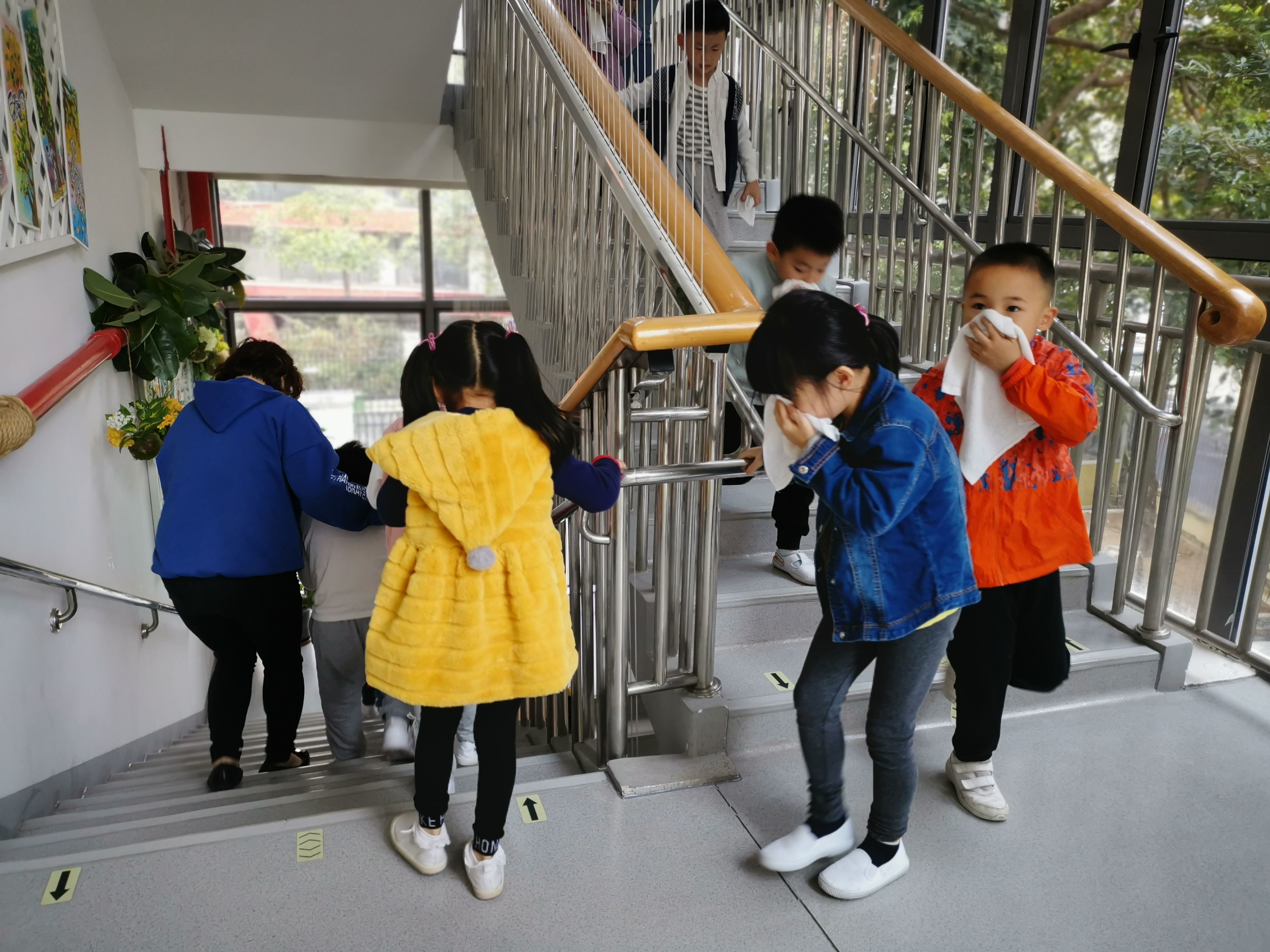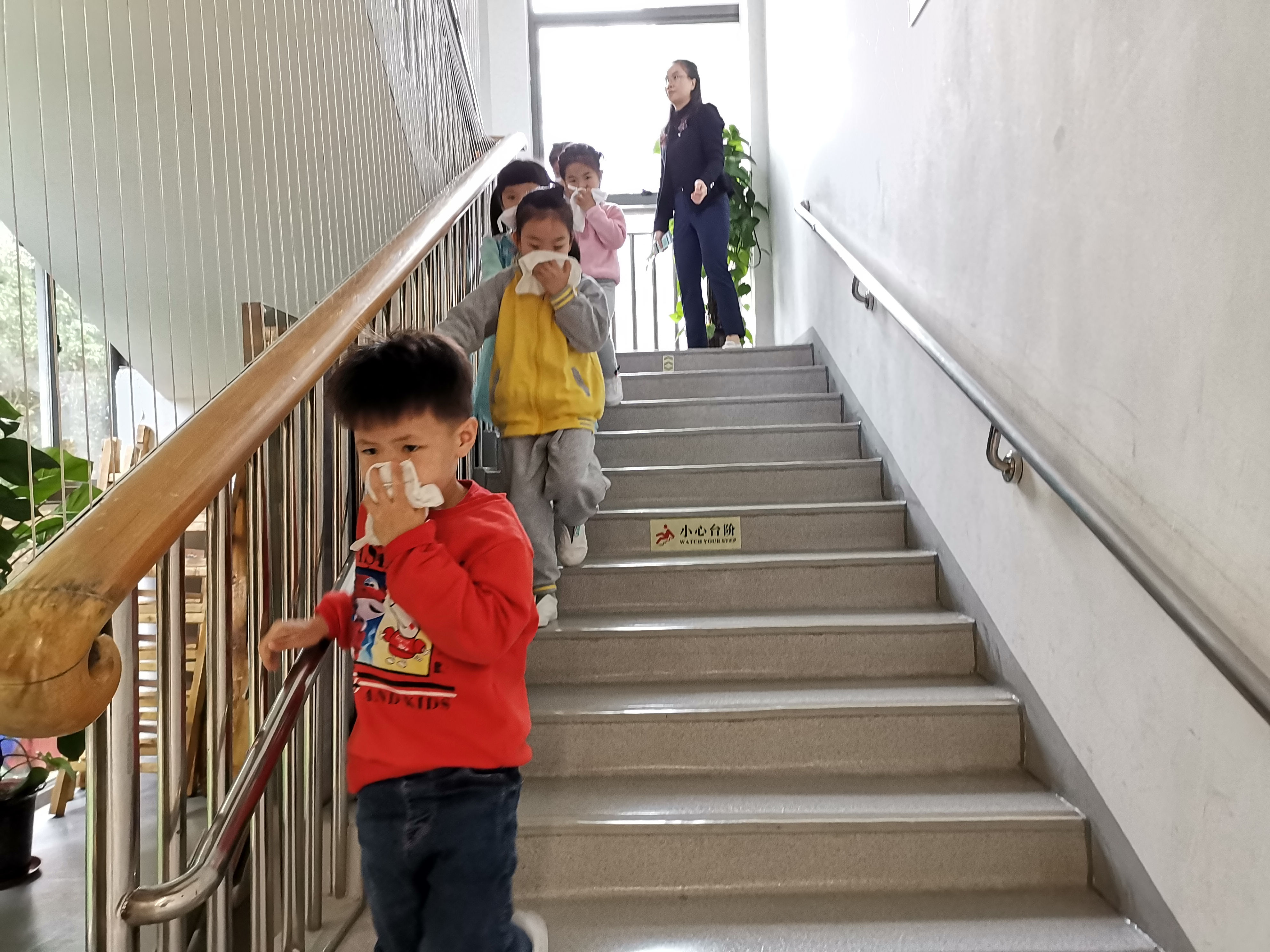 警铃声一响,德弘园和荣悦园各班的孩子们在老师的组织和带领下,有序的用湿毛巾捂住口鼻,按照既定的逃生路线逃生,各行政人员、后勤人员以及园医们均按照预先的安排在各地定点组织,保障孩子们的人身安全。