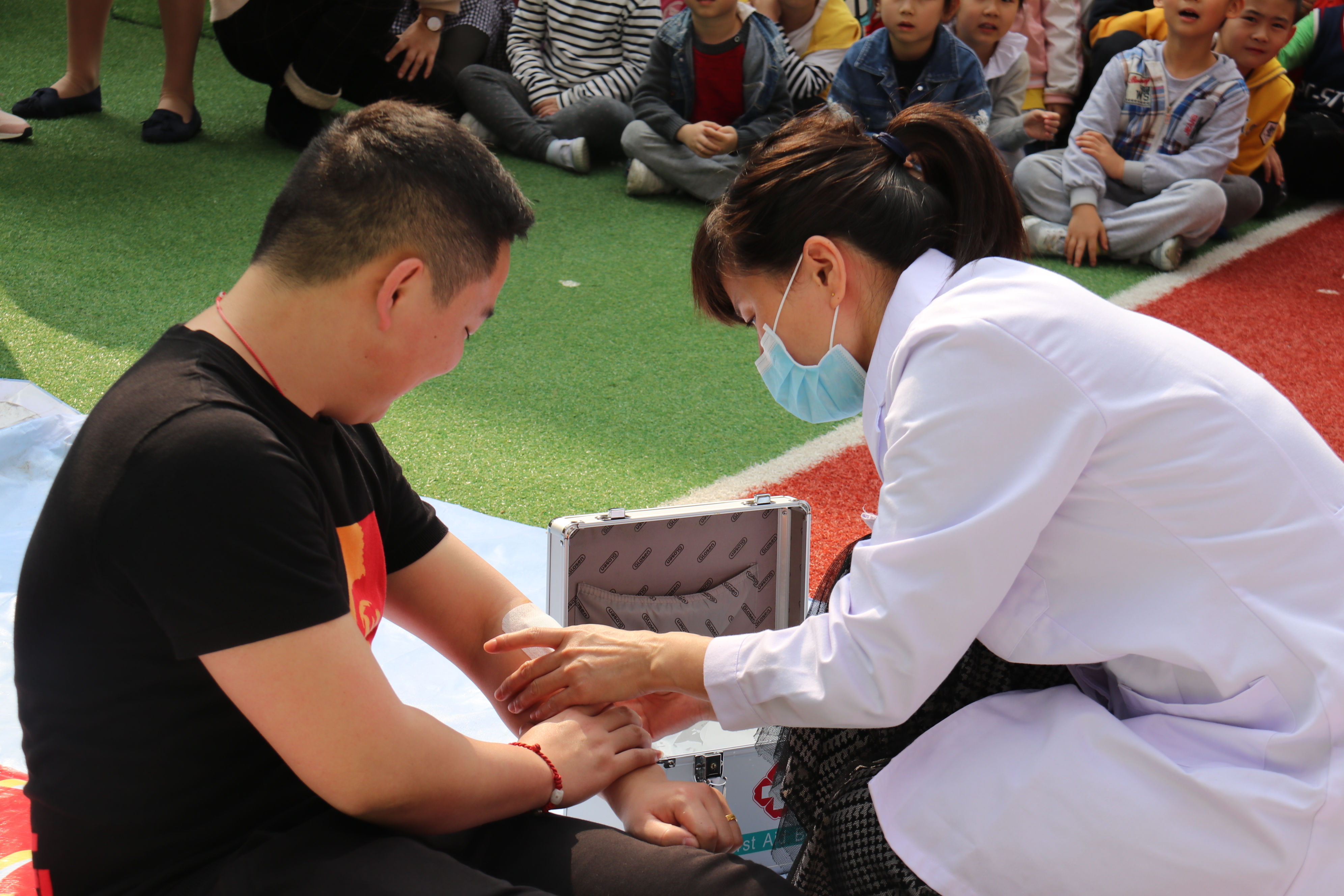 短短几分钟,全部的老师和孩子们便火速于操场中心空旷区域集中,各班有序站位、查看人数、报告,所有流程一气呵成。荣悦园的义务消防队的队员为全体师幼展示了灭火器的使用,子义老师模拟了撤离过程中受伤的人员,医生进行现场包扎模拟。
