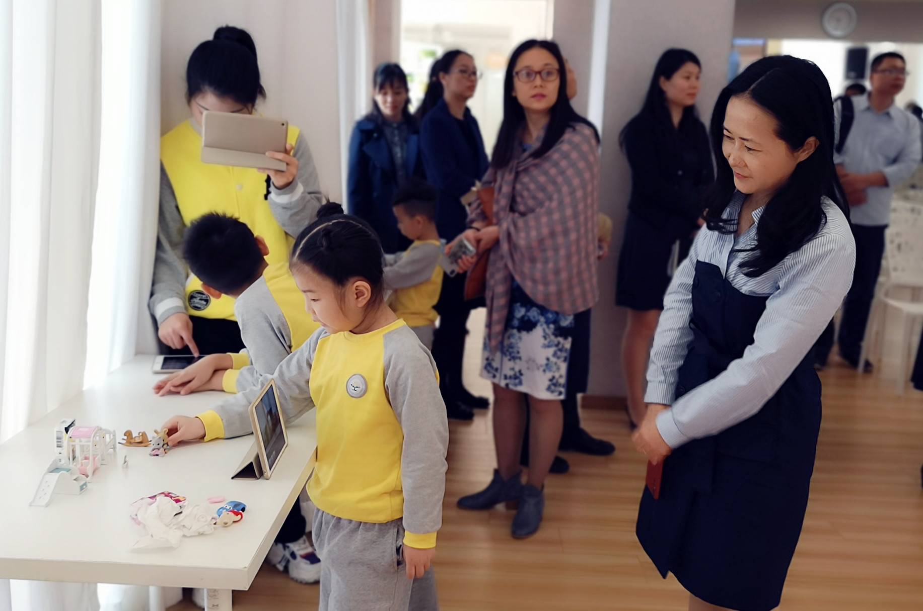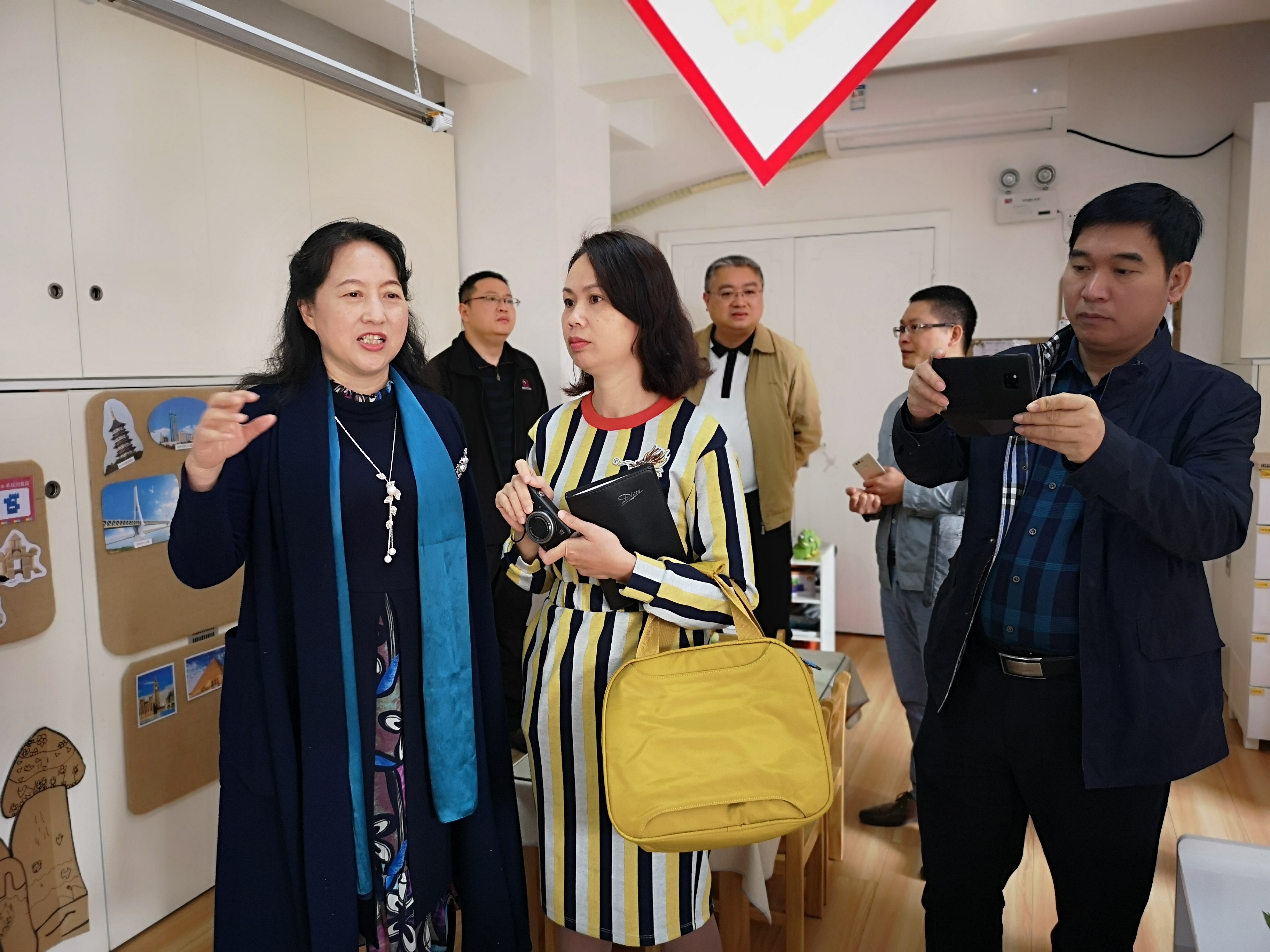 全体观摩人员在郭琼总园长的带领下首先观摩了我园幼儿运用现代化与互联网手段开展的语言活动并观看了数据化信息技术在我园后勤工作中的运用。