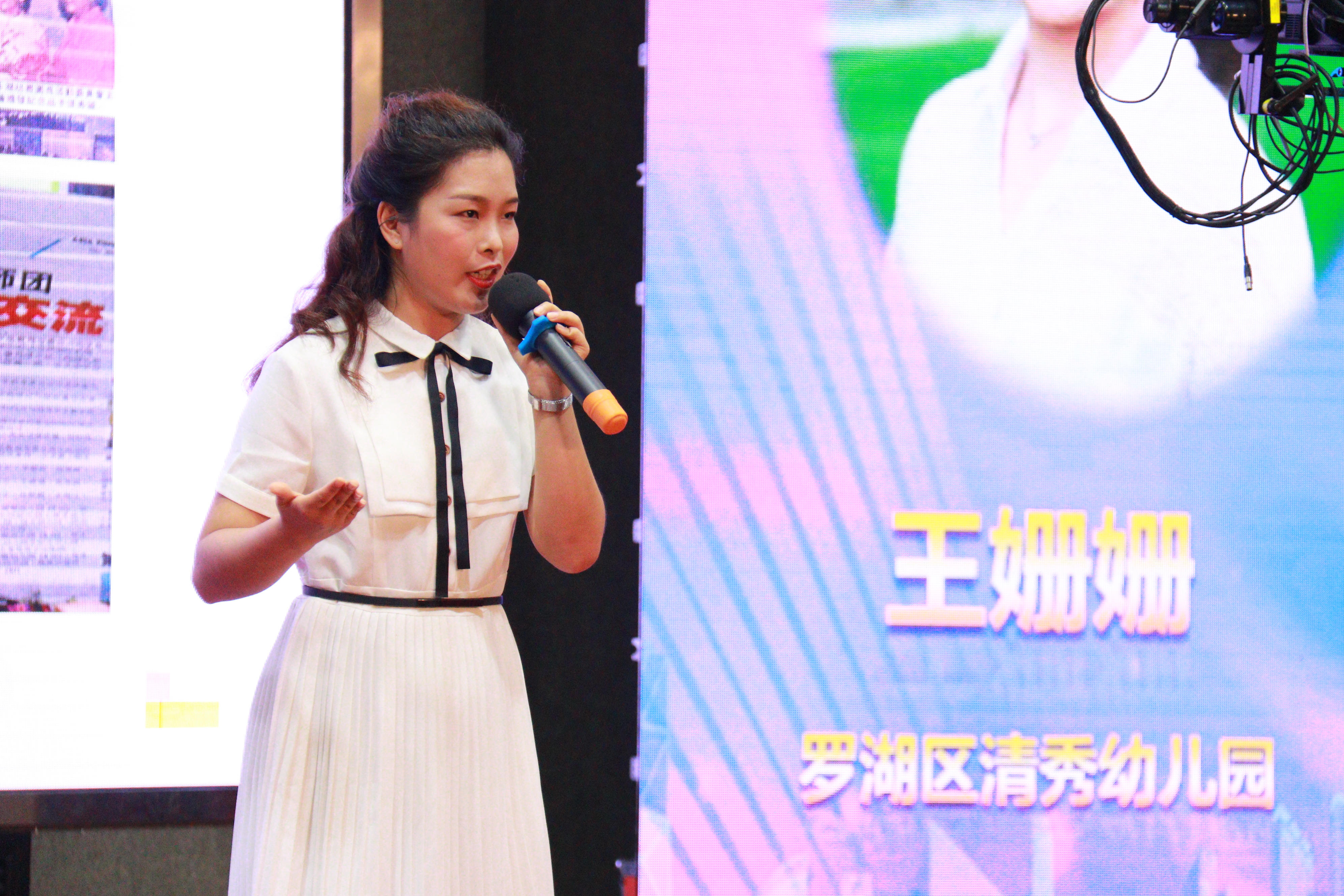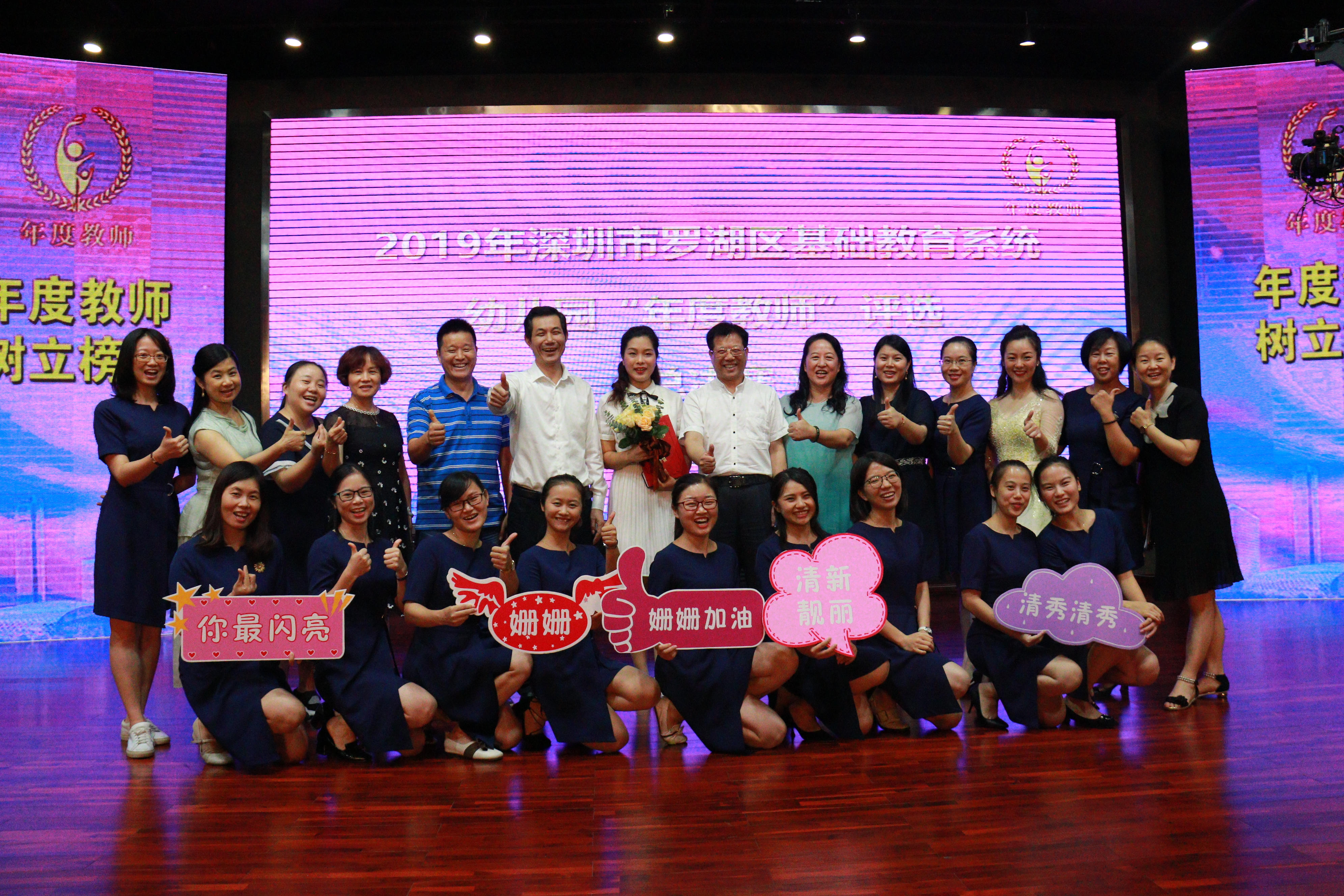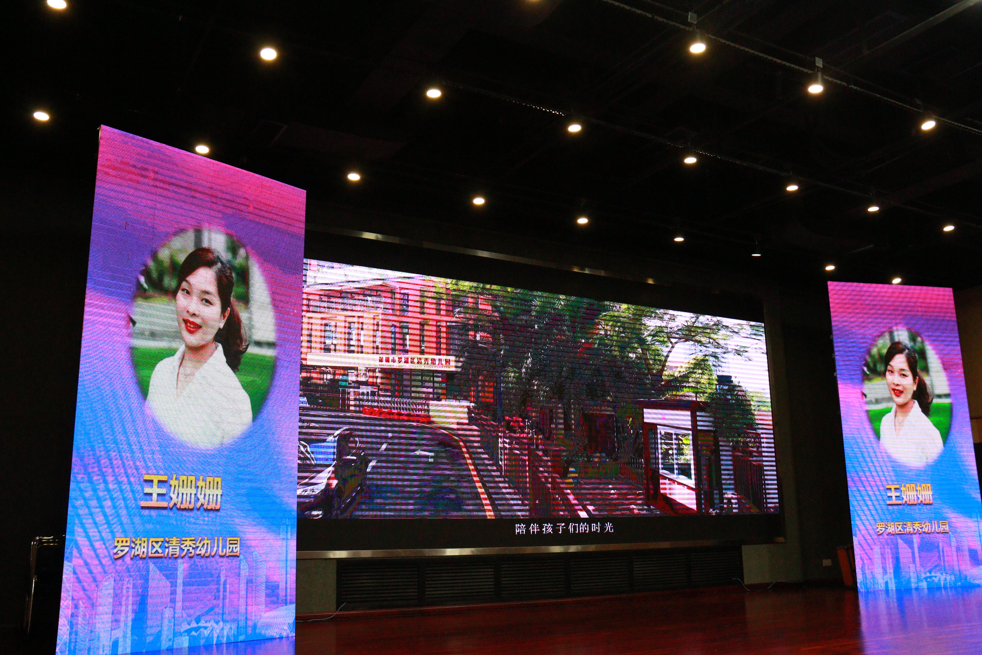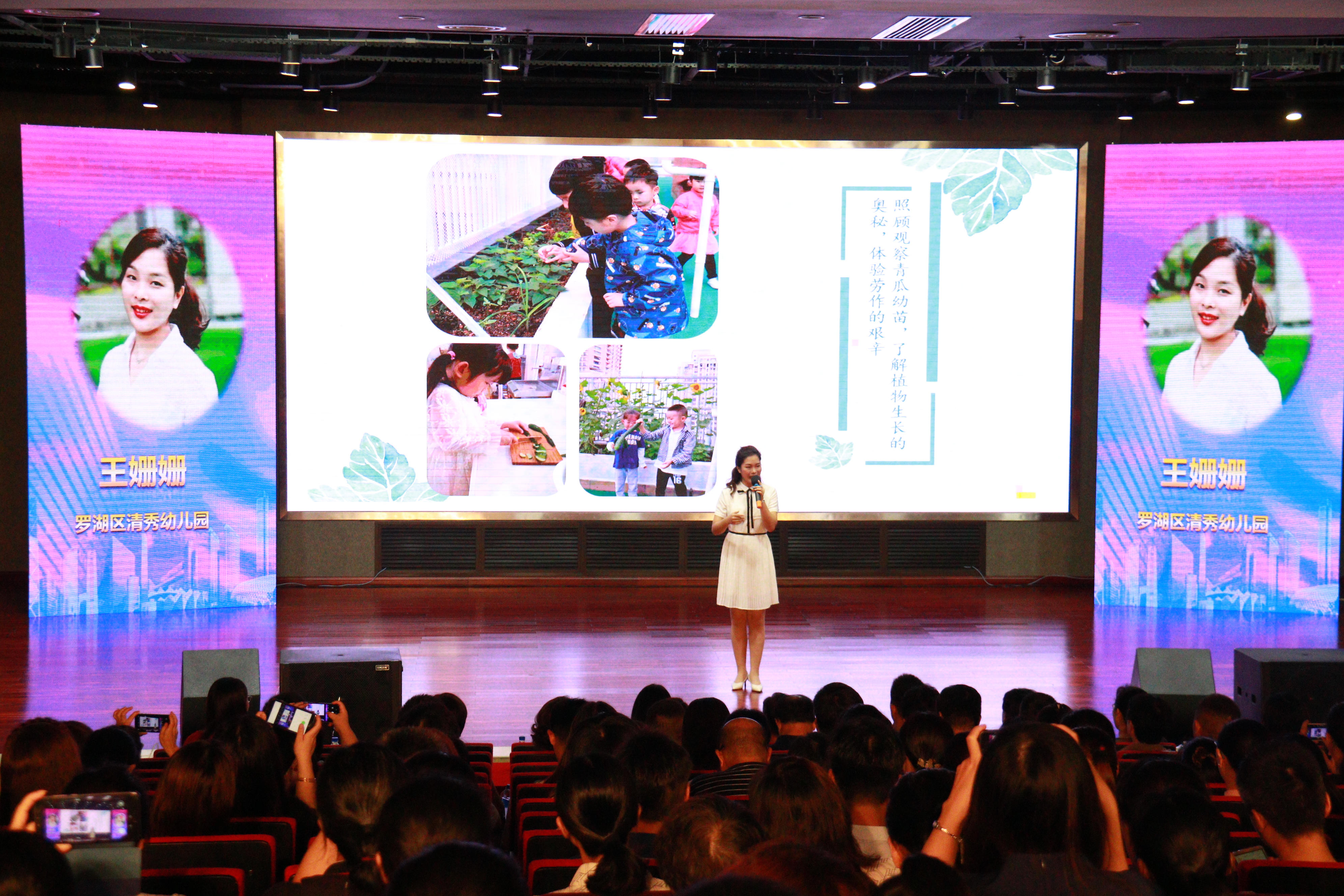 决赛现场由学前教育专家、园长名师、校长、社会人士和罗湖区家委4大评审团就候选人的影音风采展示、自由演讲、智慧答辩和无领导论坛四个环节进行现场展示、无记名投票。首位出场的我园王姗姗老师脱颖而出,一举摘得2019年罗湖区幼儿园年度教师的桂冠!