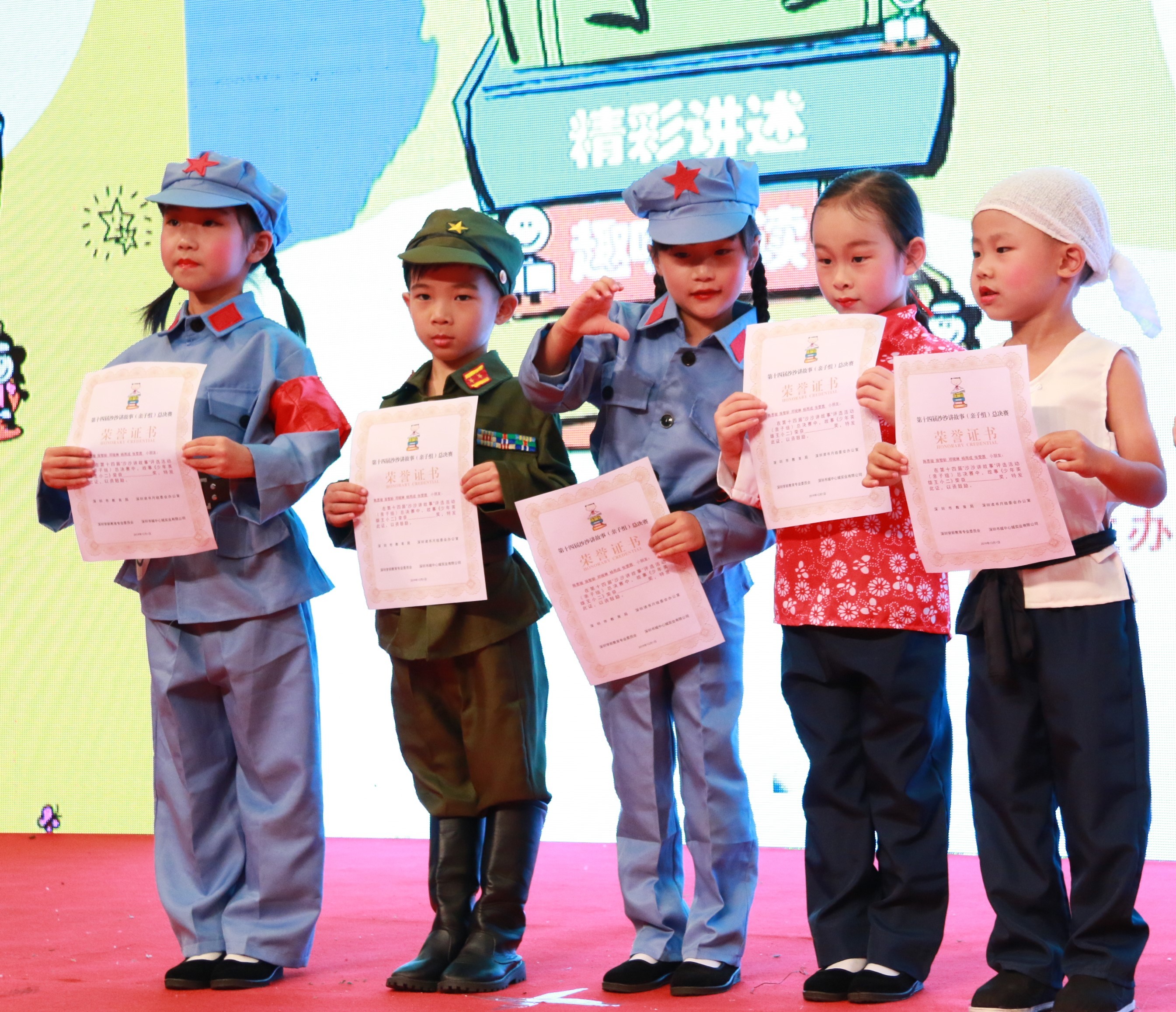 罗湖区清秀幼教集团(德弘总园)选送的故事《少年英雄王二小》在9月份的罗湖区半决赛中脱颖而出,荣获区级特等奖,从而获得进入今天总决赛的资格。在总决赛中,全市各区共选出18个优秀(亲子组)故事作品参与特等、一、二、三等奖的角逐,可谓高手云集。 “王二小”的出演顺序位于最后的18号,孩子们的压轴表演不负众望,将英雄故事生动地讲述,最终用完美的演绎证明了自己的实力,一举拿下一等奖!