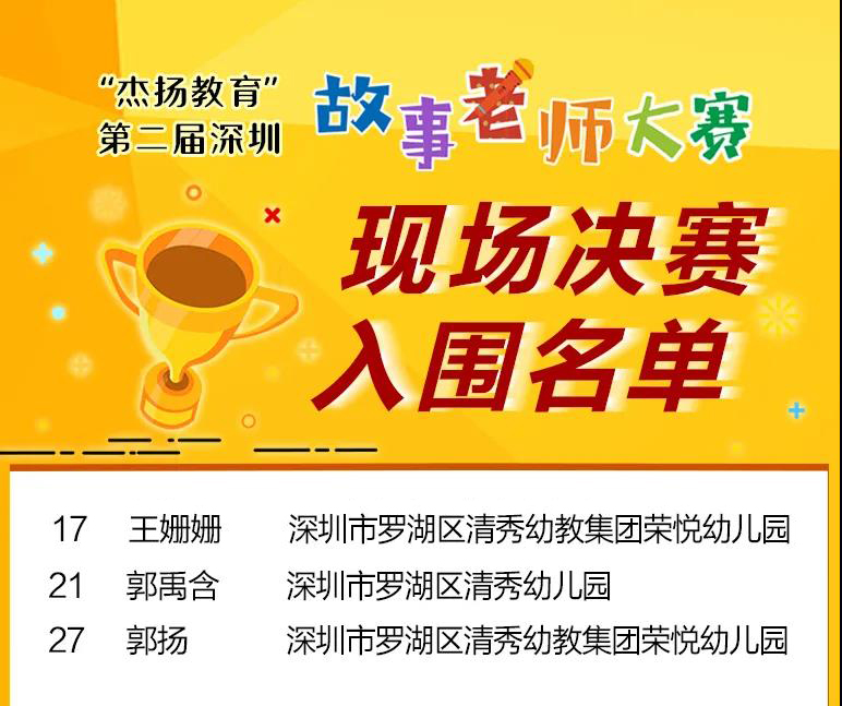 在经专家两轮细致严谨评审,并经过“深学”APP上投票评选,罗湖区清秀幼儿园郭禹含老师,清秀幼教集团荣悦幼儿园王姗姗、郭扬老师,最终从百强选手中脱颖而出取得“杰扬教育”杯第二届深圳故事老师大赛现场比赛的“入场券”。