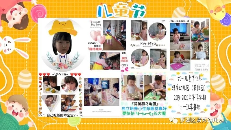 清秀幼教集团德弘总园的老师和孩子们通过班级云端谈话、发放调查问卷的形式,一同思考节日的庆祝方式。几经讨论,孩子和家长、老师们一致决定用视频舞台的方式庆祝“云六一”!“云端舞台”里,孩子们诵诗文、讲故事、说谜语,道祝福,传递节日的欢喜;更有小天才们大显身手,通过乐器演奏、舞蹈表演、手工绘画等,上演不一样的视觉盛宴。幸福过六一,节日爱相随,孩子们制作美食、服务他人、同唱一首歌致敬奉献的伟大。