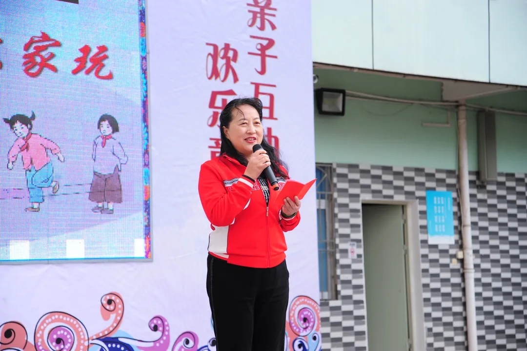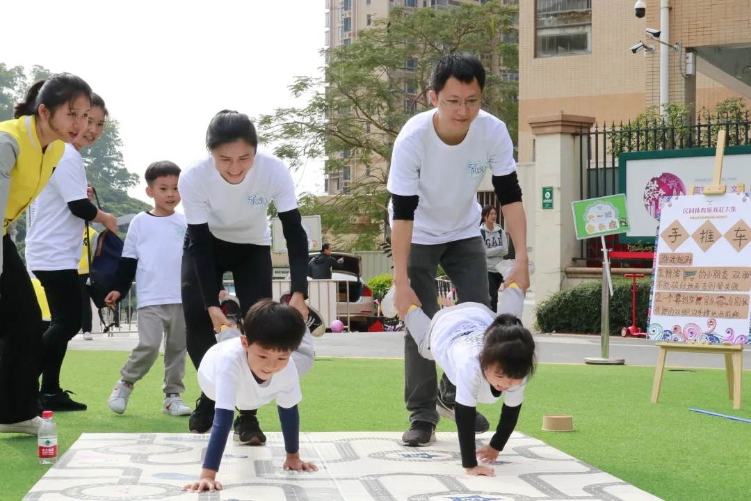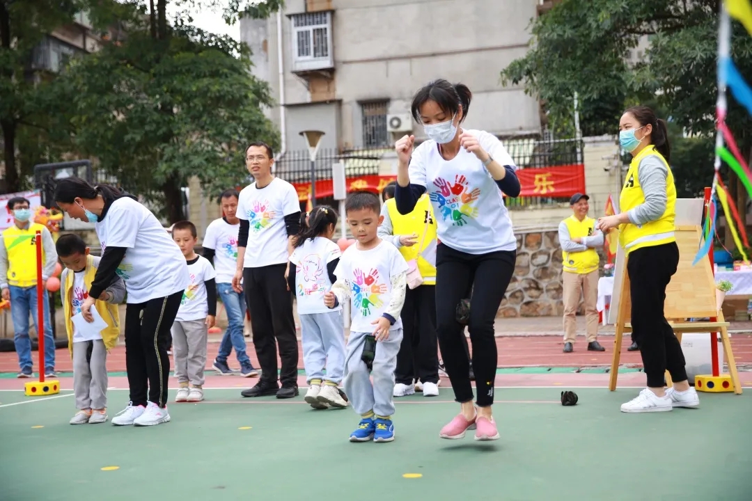 上午10时,“千人大跳绳”拉开了体育节序幕,4家园所在的体育场上哨声四起,片片欢呼,大家一同迈开了双脚,抡起了大绳,玩起了“花式”跳绳——多人齐跳绳、轮番上阵跳大绳、亲子双跳绳、幼儿跳绳。在体育节核心环节中,集团各园根据各年龄段幼儿的能力和发展特点,精心挑选与设置恰当的民间体育游戏——套圈、跳房子、炒豆豆、盲人击鼓、两人三足、手推车……老师设摊位,亲子同体验,你玩、我玩、大家玩。孩子们在各色游戏中体验趣味、锻炼身体;家长们在参与中回味童年,在陪伴中感动孩子的成长。