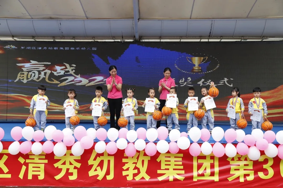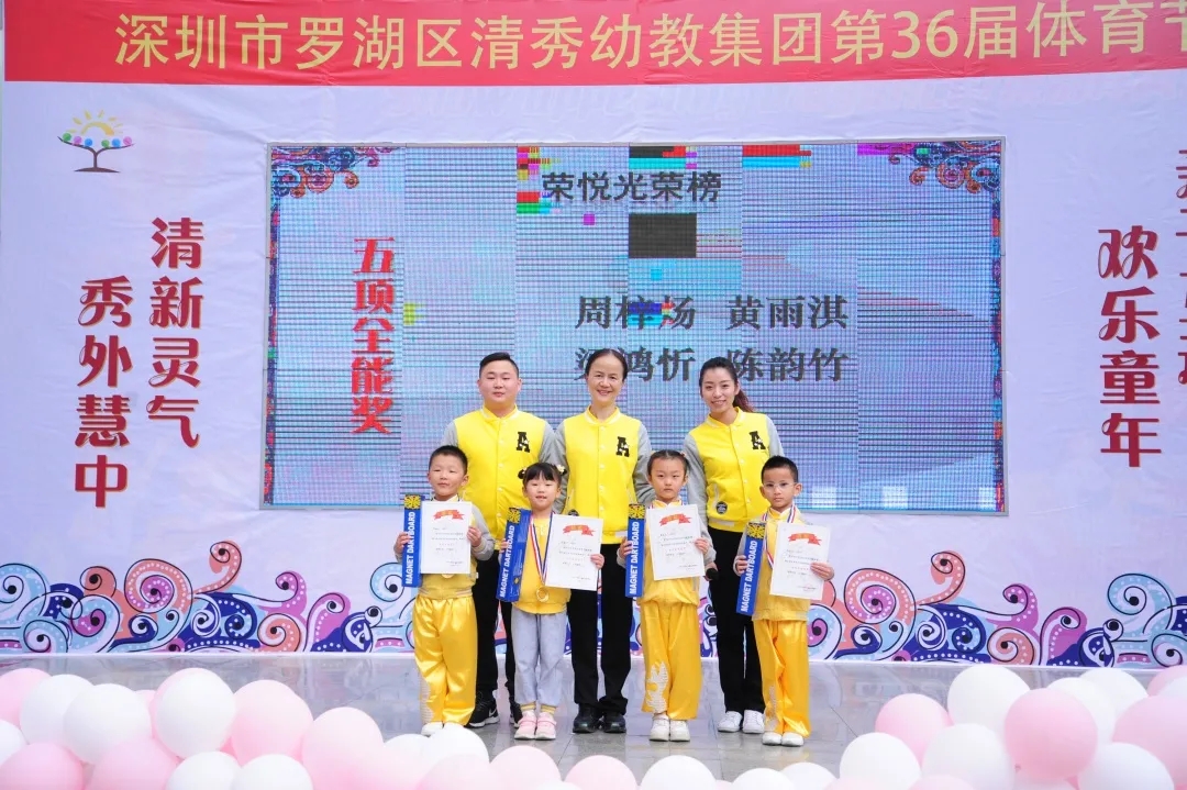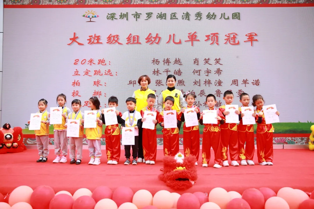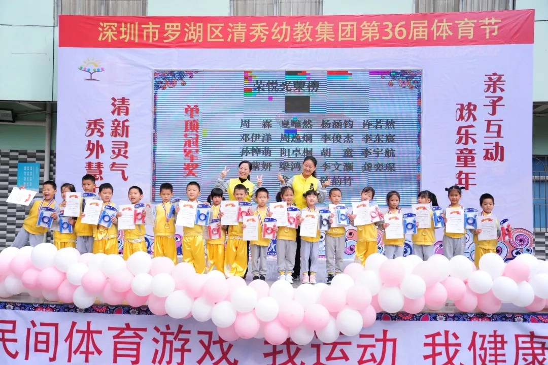 清秀幼教集团郭琼总园长心系幼儿健康,奔赴各园体育运动会场激情发言,讲话中特别提到:“清秀幼教集团高度重视孩子的身心健康发展,通过开展各色科学运动,帮助孩子达到“健体、健美、健脑、健心”的和谐统一。”运动会上还对“立定跳远、拍球、20米短跑、单脚立、投掷”男、女单项及“五项全能”的获奖幼儿进行了表彰。