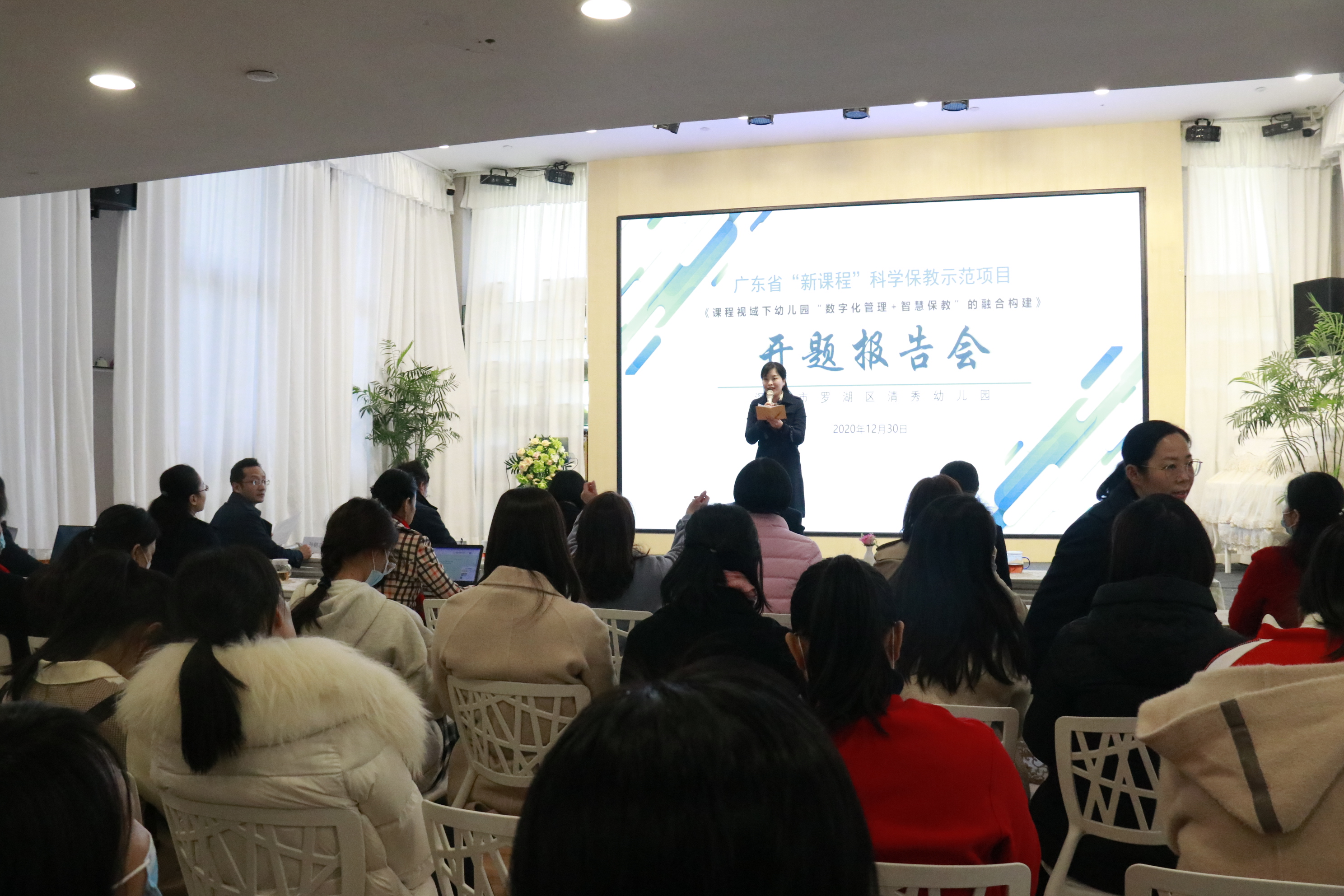 2020年12月30日下午,广东省教育厅“新课程”科学保教示范项目 ——罗湖区清秀幼儿园课题《课程视域下幼儿园“数字化管理+智慧保教”的融合构建》开题报告会在罗湖区清秀幼教集团荣悦幼儿园音乐厅隆重举行。深圳大学师范学院学前教育系主任刘国艳副教授、深圳信息职业技术学院学前教育专业主任焦名海副教授、深圳市罗湖区教育科学研究院付培之副院长、深圳市盐田区实验幼儿园张瑞华园长、二十余所参研园的园长及课题组成员约30人出席了开题报告会。