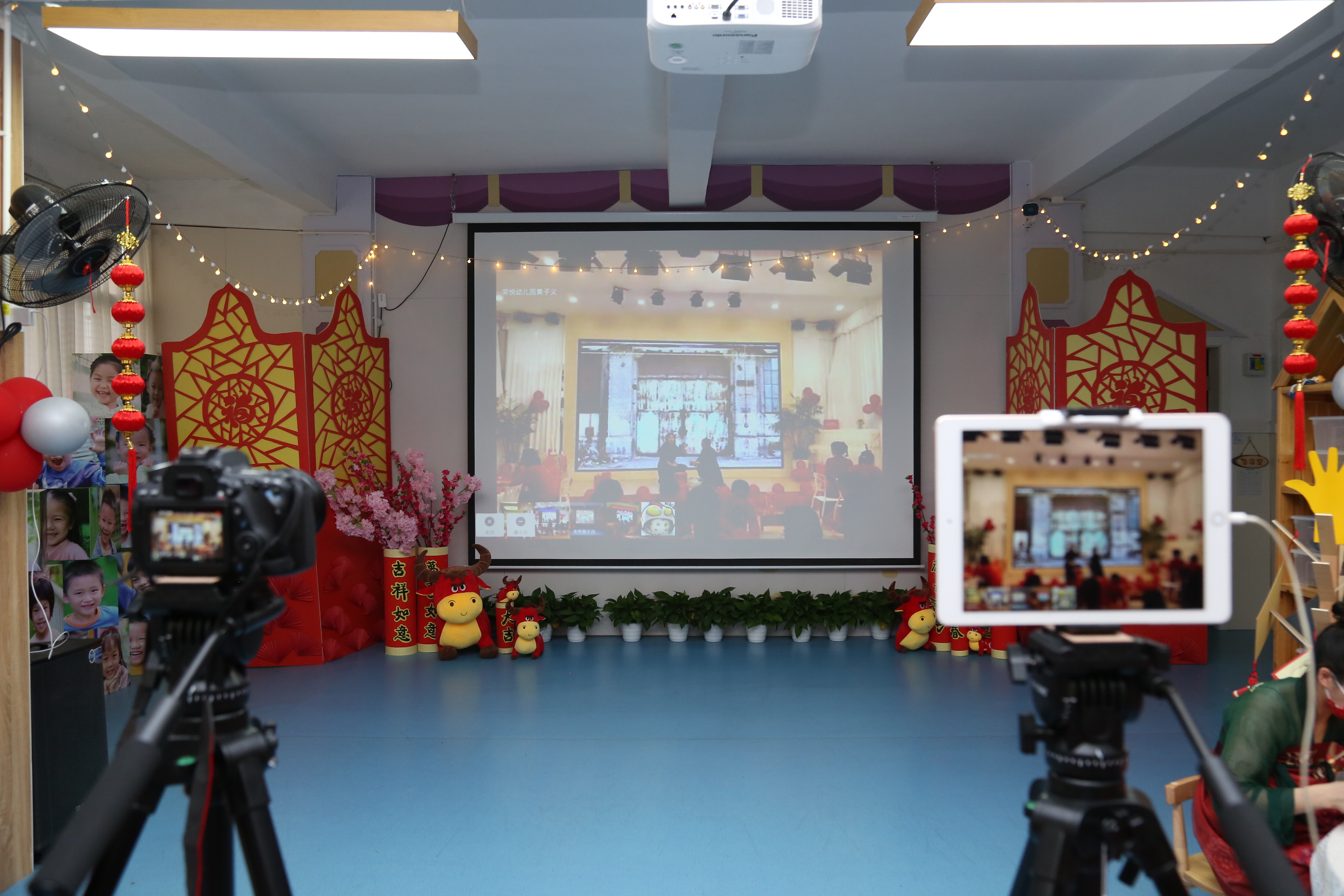 继国庆活动集团6家园2个教学点3个会场的智慧连线后,总结会线上线下会场再度升级至5个会场。活动编导组成员巧妙设置“直播”连线环节,别出心裁地以新闻直播形式将各会场主持人变身为“主播”在线,各园开展线上、线下全互动。