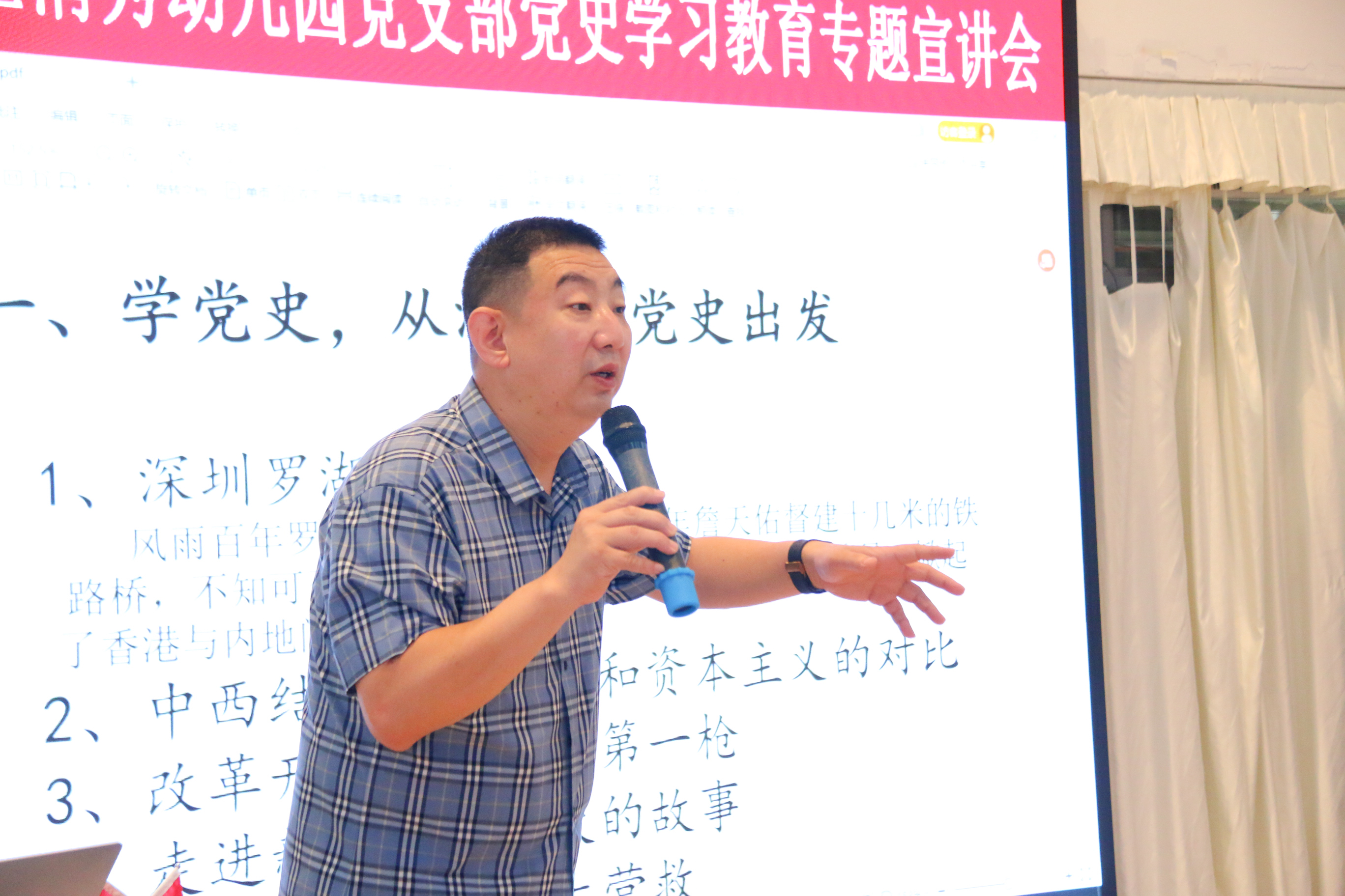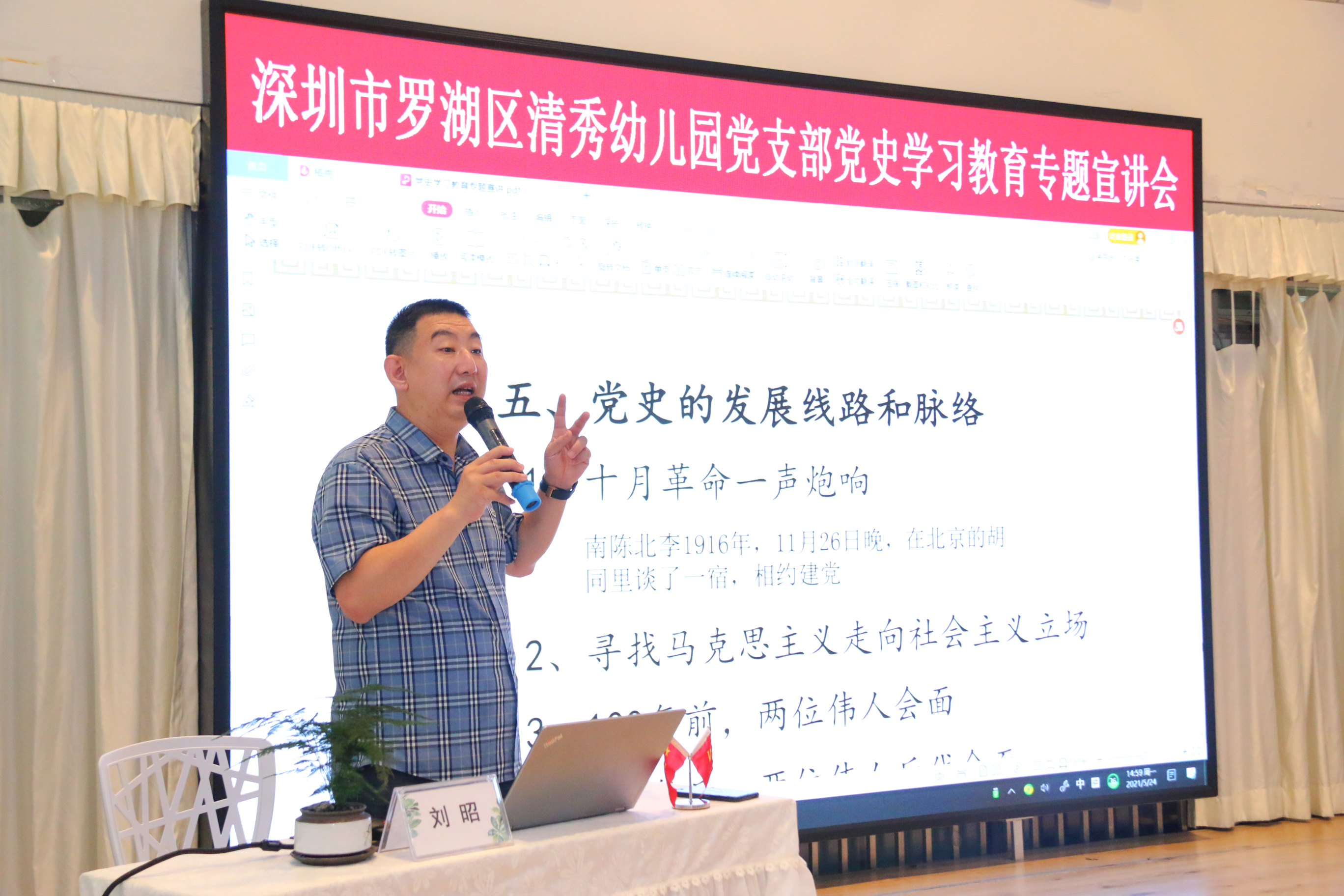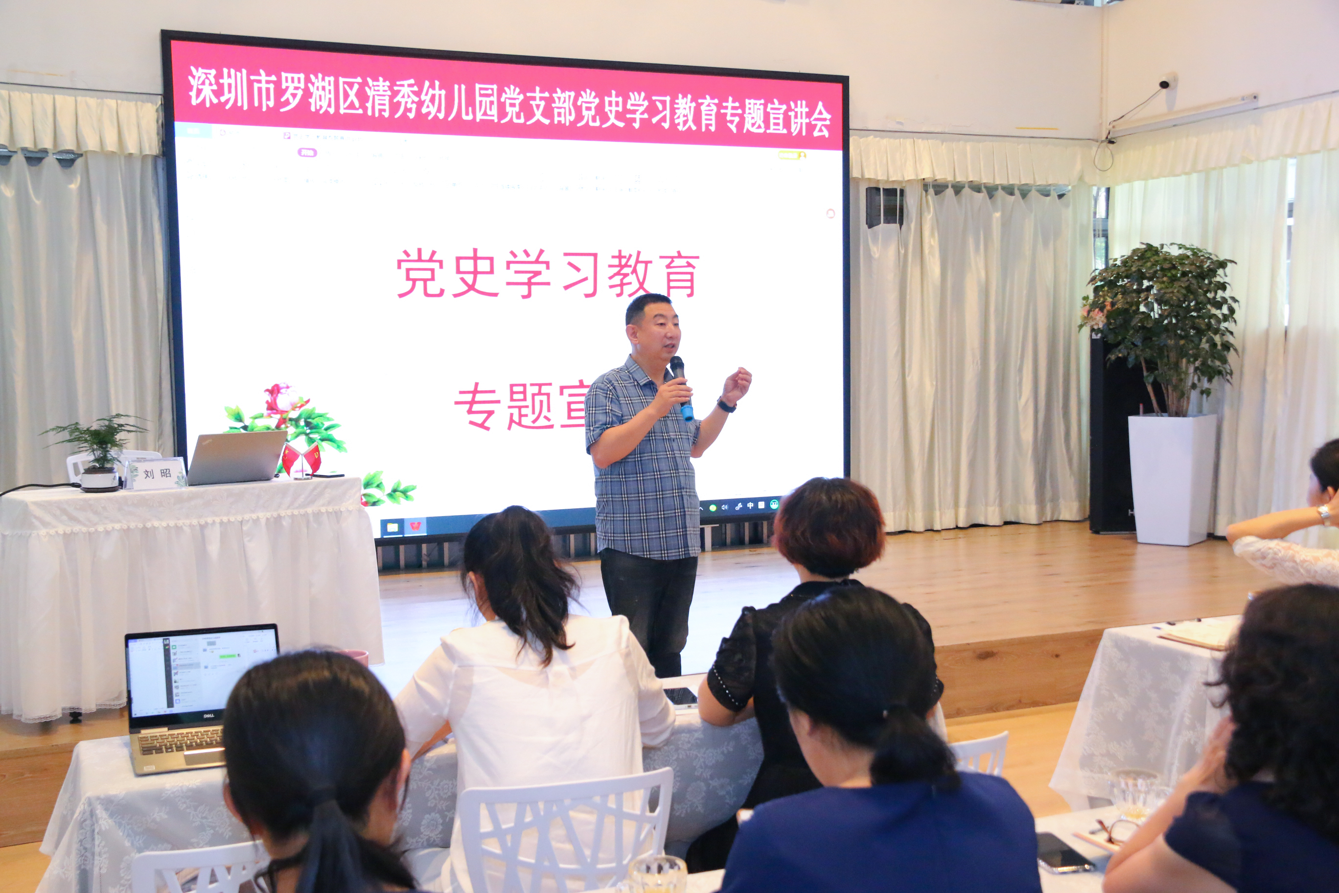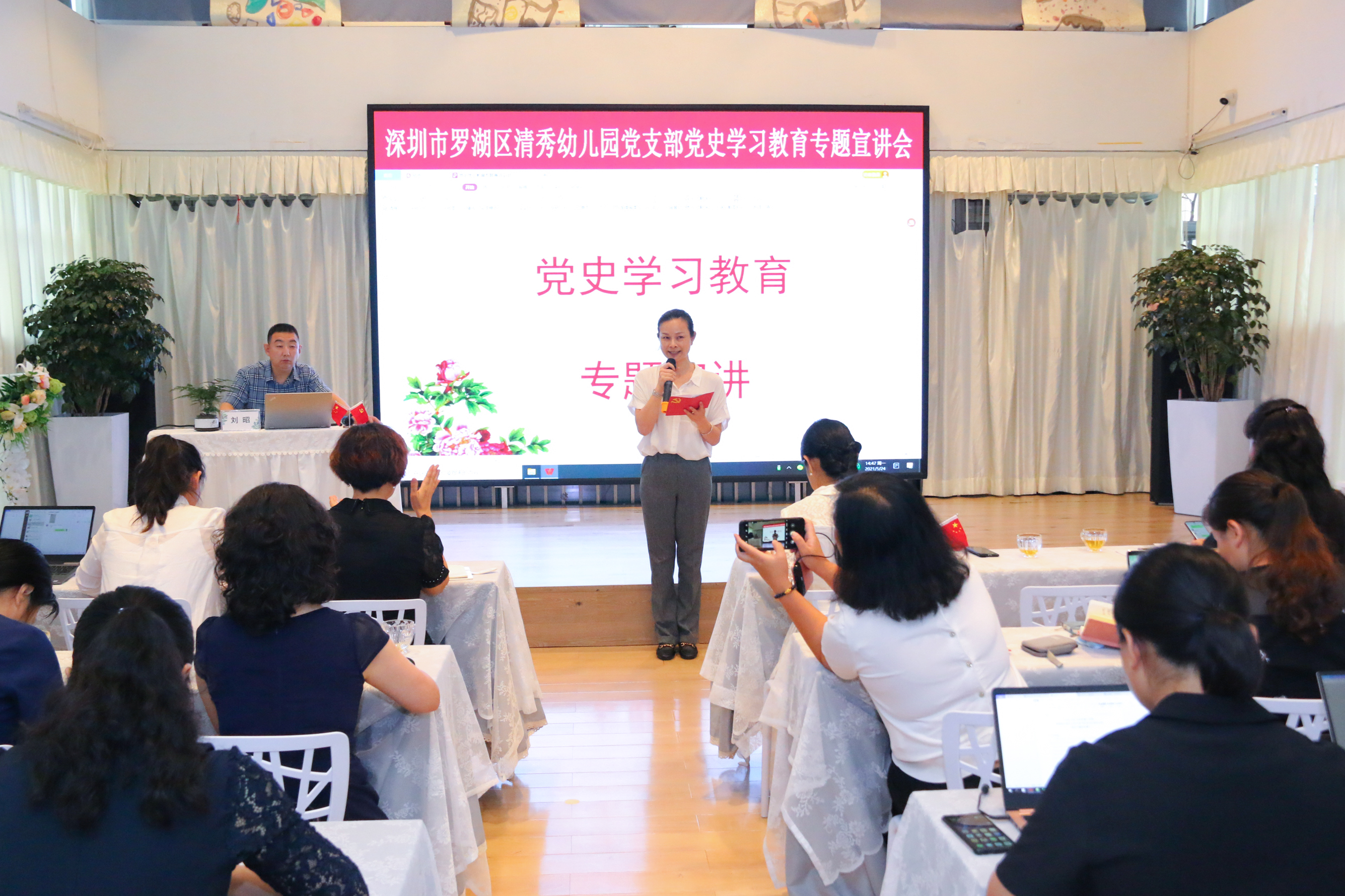 为深入推进党史学习教育活动,2021年5月24日下午罗湖区清秀幼儿园党支部邀请罗湖区委党史宣讲团成员、区曲艺协会主席刘昭老师入园开展了党史学习教育专题宣讲活动。活动由清秀幼儿园党支部组织委员张俐老师主持。