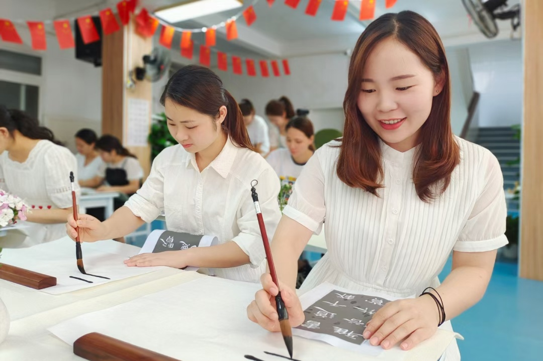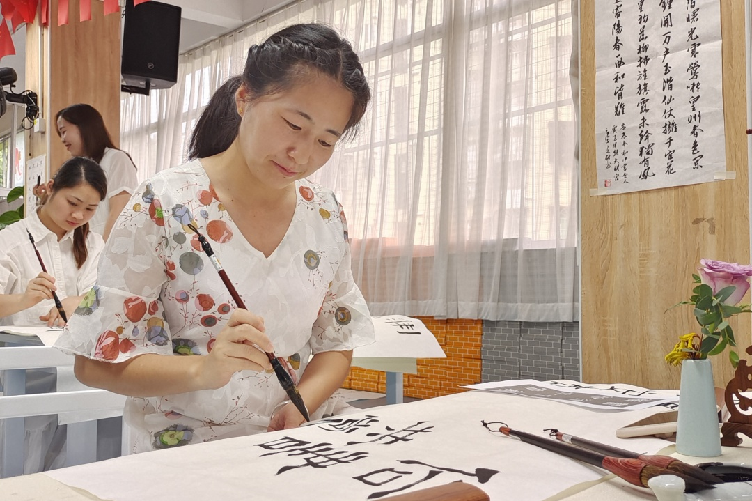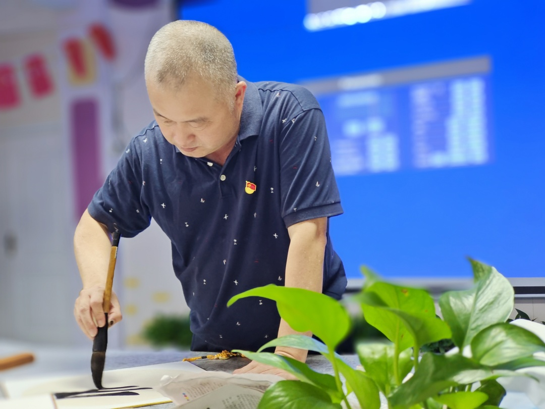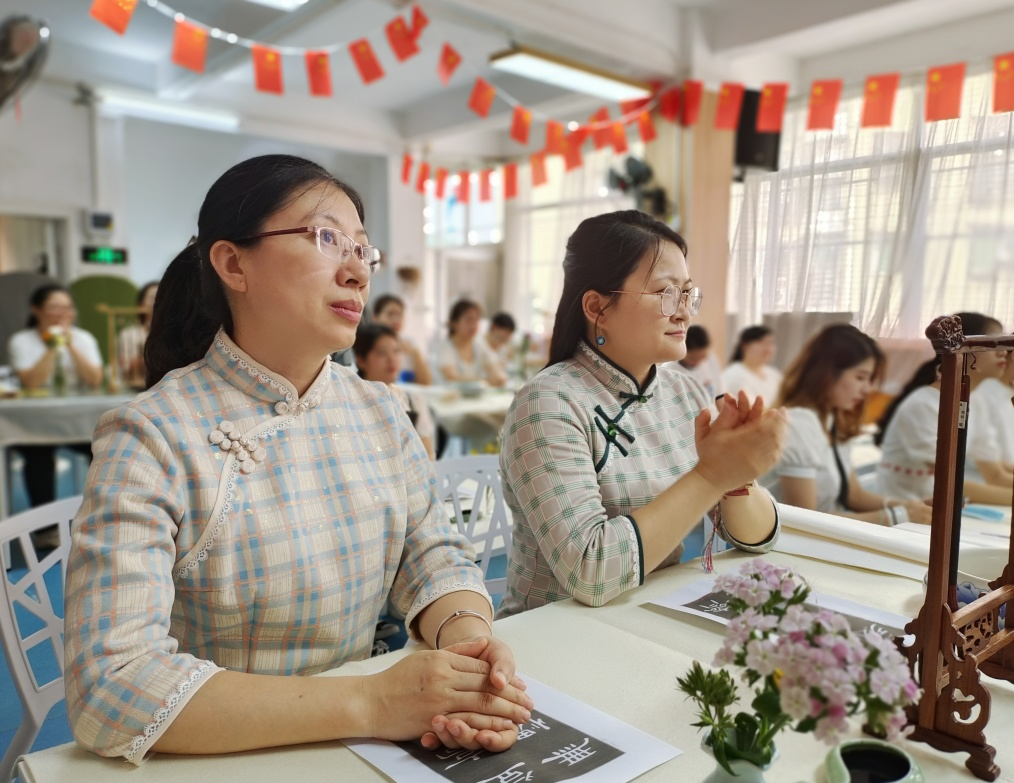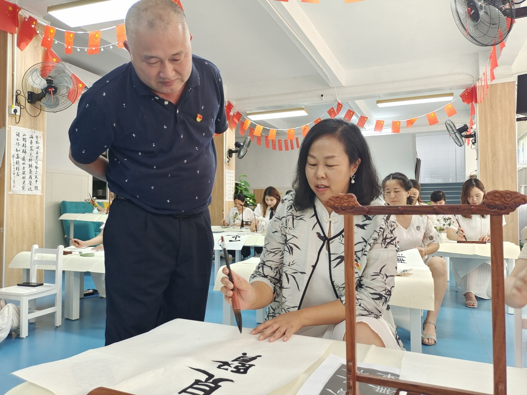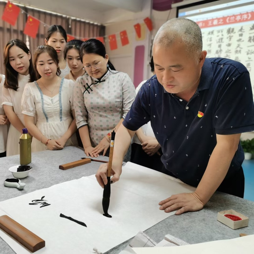 李文献书记运用通俗易懂的语言,讲解点、横、竖、撇、捺等基本笔画,与教师们交流用笔方法、点画形态、结构规律及书写技法等知识,并重点讲解示范和指导了隶书的起笔、行笔、收笔、燕尾等,深入浅出的讲解和直观生动的示范,让教师们领略了中华书法的独特魅力。