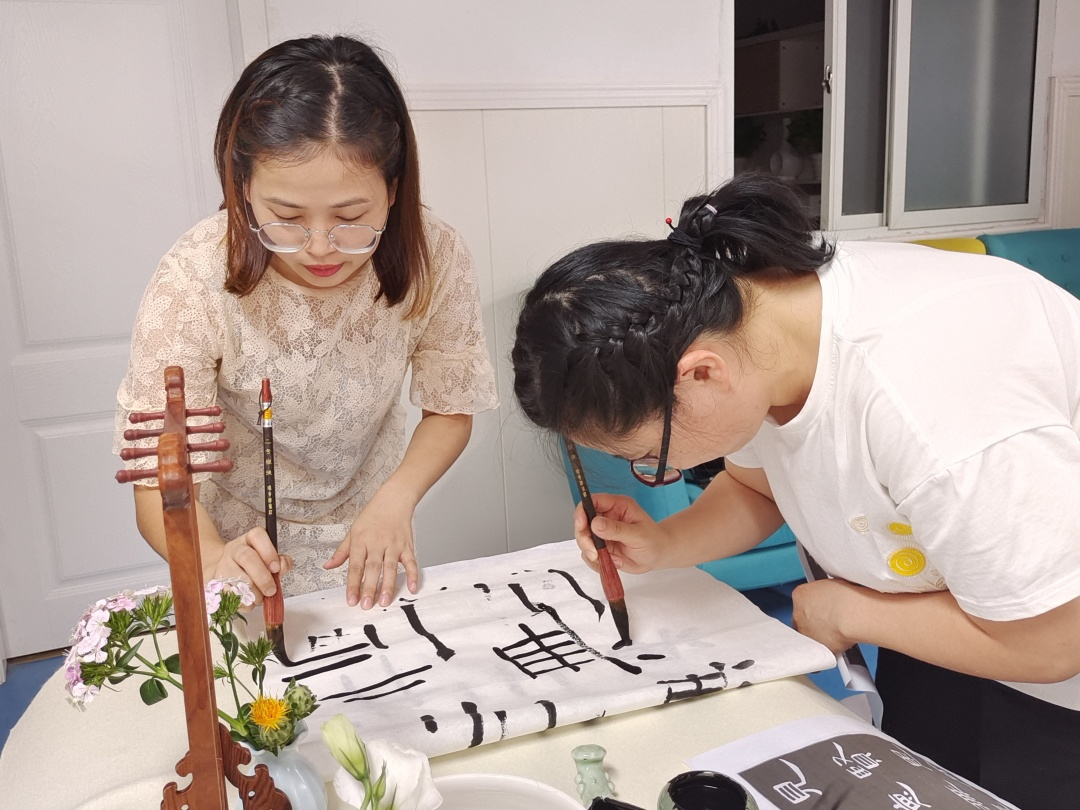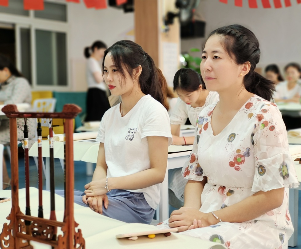 笔墨生香,一字一画,在优雅静谧的氛围中,教师们静下心来,细细品味书法魅力,书记指出:隶书本身具有装饰之美,而其横长竖短、一波三折之笔韵,以及“燕不双飞”的筑字之精巧都展现了中国汉字发展过程中的文化底蕴及博大精深。篆书的“和”与“善”两个字,不仅是李文献书记对清秀雅乐园的亲切感受和美好祝愿,更是对中国汉字的热爱和领悟,“合”字寓意稻谷丰收之后人们在一起吹奏乐器,合乐而美好;“善”寓意在祭祀的时候说的话至善至美。老师们听了书记的解读,深刻感受到汉字里渗透的智慧与文化内涵的传承。