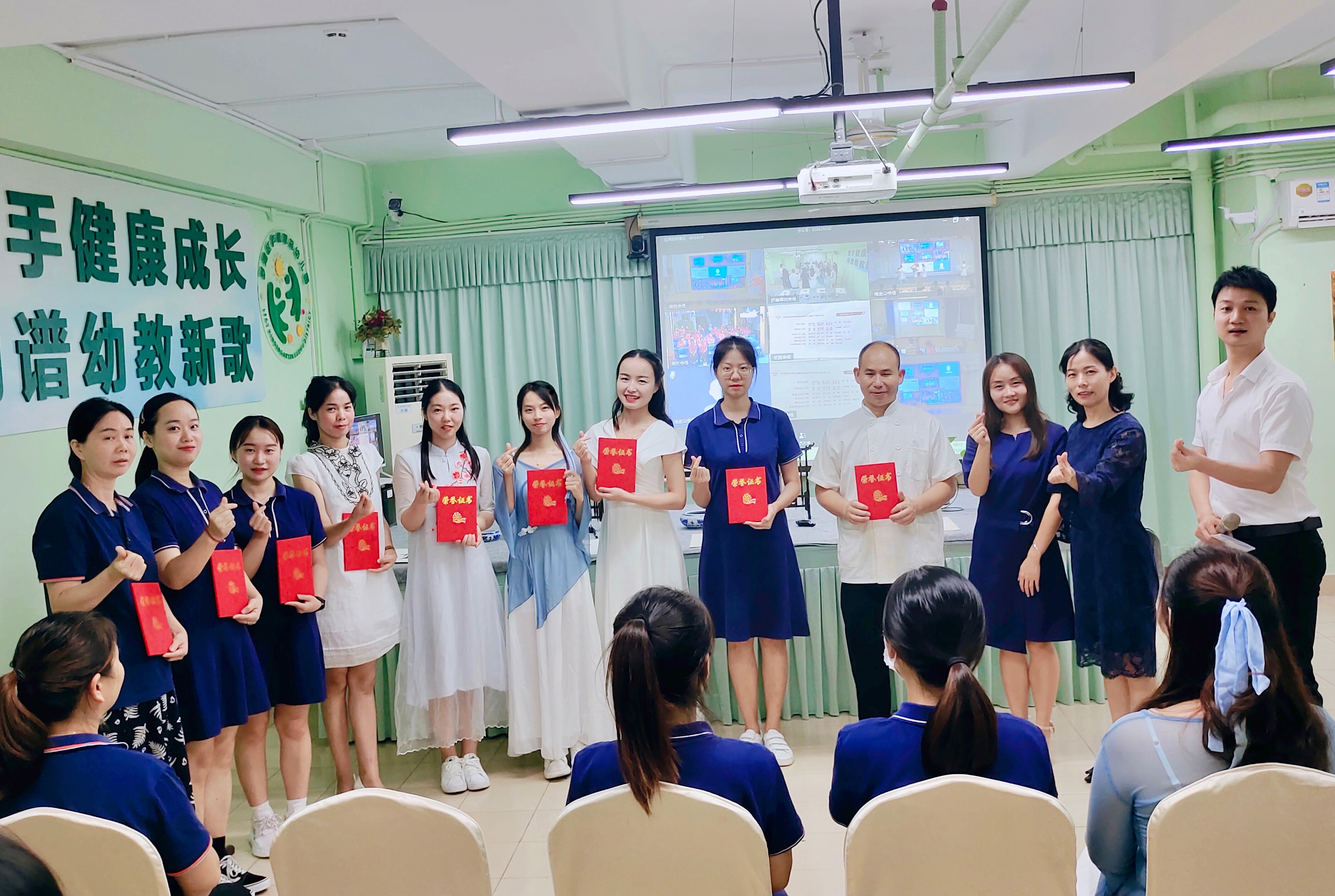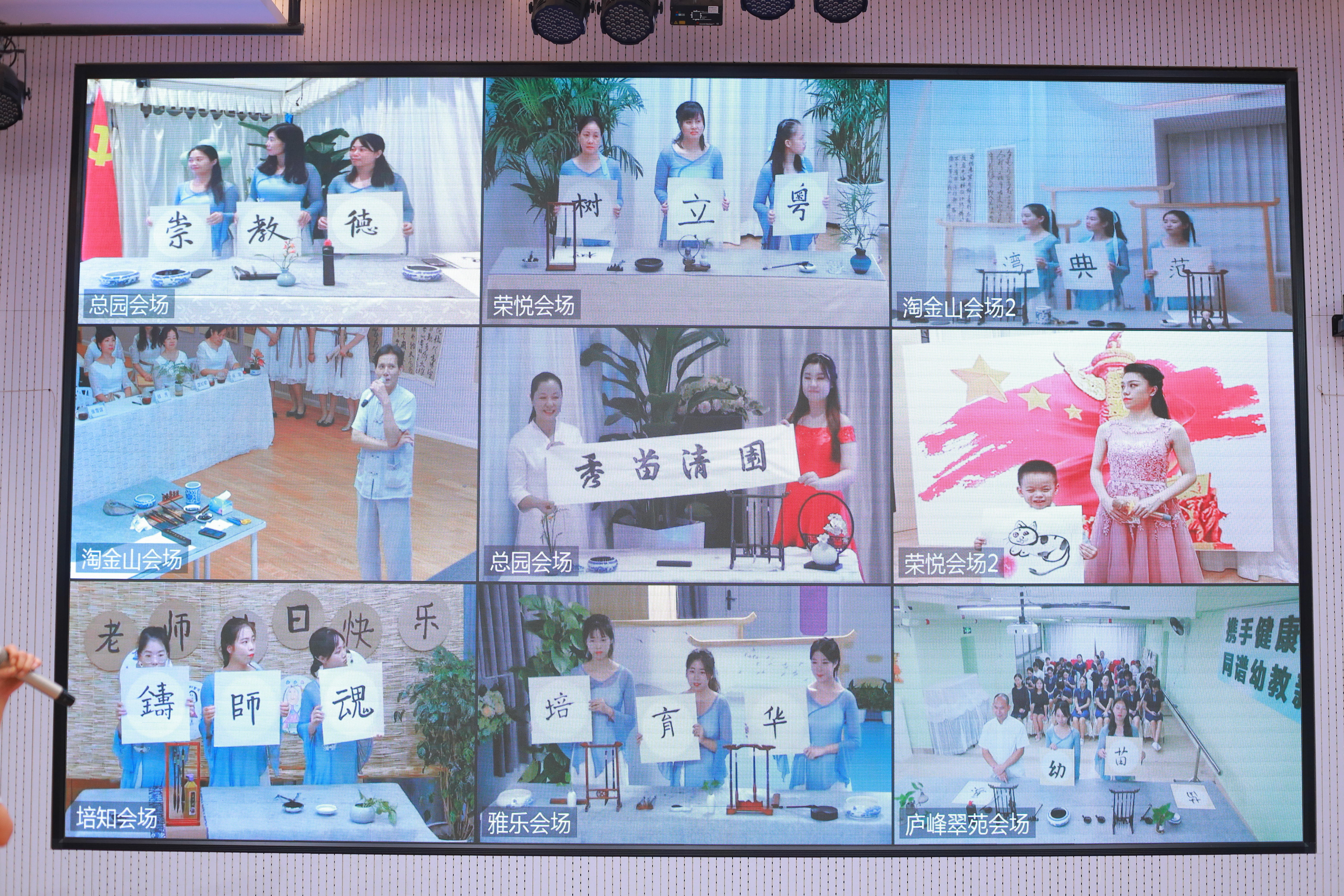 为培养教师的艺术审美与鉴赏的能力,集团特邀书法专家杨先河老师开展了以《漫谈书法的鉴赏与审美》为题的讲座,带领全体教职工一览书法艺术长河。从书法的定义出发,杨老师通过在线圈点示范,与大家深入浅出地剖析书法欣赏的标准、要求和要素,更向大家娓娓道来书法鉴赏的十大视点,让线上线下的老师们获益匪浅。专题讲座后,杨老师与集团各园老师代表、幼儿代表通过可视互动、现场挥动笔触,共抒节日情怀,写下了“崇教德,树立粤湾典范;铸师魂,培育华夏幼苗;横批:”园清苗秀”的美好愿景。