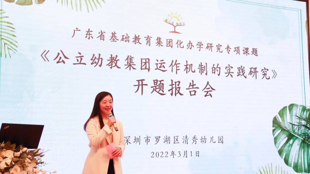 湾区基础教育研究中心项目负责人副研究员李贤博士宣读了课题立项通知,并对课题的立项表示祝贺。课题主持人清秀幼教集团郭琼总园长作开题报告,她从研究背景与依据、研究目标与内容、研究思路和方法、研究阶段与预期成果详细阐述了课题研究的整体设计。