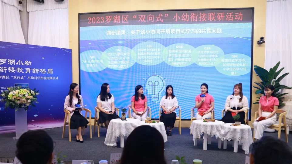 与会人员分组参观了幼儿园环境、项目式学习课程展和各班级活动,深入现场全面了解幼儿园如何开展和渗透“身心、生活、社会、学习”四个方面的入学准备。四位园长、校长围绕学校在小幼衔接方面所进行的实践工作进行汇报。透过汇报,我们看到各学校充分挖掘周边资源,“校园”联动,通过开展丰富多样的小幼衔接课程,打造特色小幼衔接实践品牌,探索构建罗湖区品质课程,各校、园在小幼科学衔接上的各种尝试与实践,显示出罗湖教育人的智慧与担当。六名来自不同学校和不同层级的教育工作者围绕“幼儿园与小学协同开展项目式学习”话题进行对话,代表们从“价值意义、培养目标、实施路径、驱动问题、幼小异同以及成果评价”六个方面解析幼小协同开展项目式学习中所面临的难点问题,视角多元,汇聚智慧。