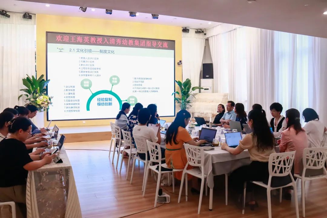 走进教育现场,王教授参观了幼儿园室内外环境,透过主题墙内容呈现、区域材料投放、幼儿现场活动观察感知幼儿学习、活动的路径与状况,了解幼儿基于当下生活和身边环境的真实感知及经验获取。郭琼及与会各园所管理人介绍了清秀集团及各园所的课程构建与现状。王教授结合教育现场参访实况及汇报内容,充分肯定了清秀幼教集团的依托资源的课程建设思路,指出当集团有完整课程时,园所的园本课程方能与集团课程相关联。与此同时,王教授从儿童出发的课程方案、1与N的课程关系转变、建设园本班本小组课程三个视角,为清秀“1+N”课程体系的未来提升提供了专业的指导意见。