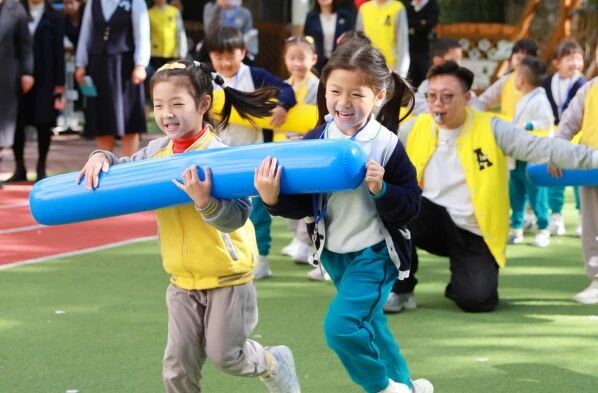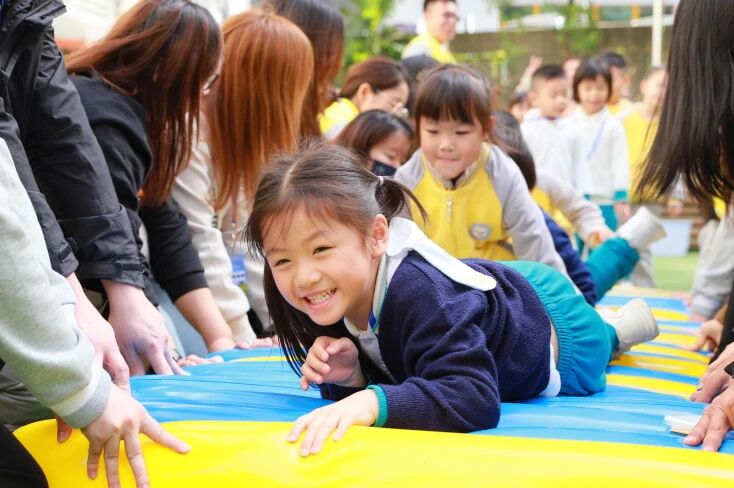 活动以“丝绸之路”文化课程体验为主线,幼儿通过抽丝、制作蚕丝被与蚕丝扇等环节,亲手触摸历史,感知中华传统工艺中蕴含的智慧与合作精神。课程设计将丝路“连通、协作、共享”的理念融入游戏与操作,让深港幼儿在共同体验中自然建立情感与认知的连结。随后的亲子体育游戏以彩虹伞、充气棒为载体,通过集体协作促进家庭、教师与幼儿之间多维互动。游戏不仅是身体的舒展,更是课程中社会性学习与情感教育的生动延伸,体现了“亲师共育、家园协同”的课程实施路径。
