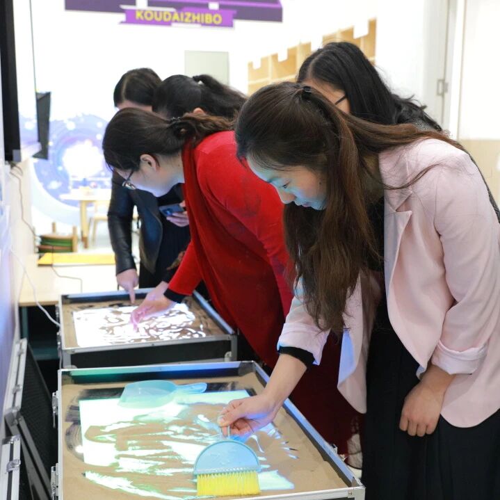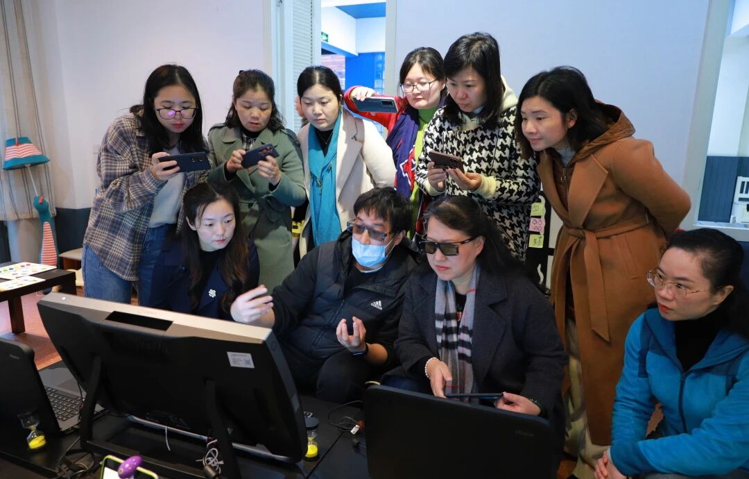 工作室成员与上海市特级教师、上海市青年教师代表等通过现场座谈、经验交流、教育现场体验等方式进行“数字化赋能教师专业发展,提升教学质量”的深度讨教。当地园所支持教师以“兴趣小组、‘民间组织’、社群学习交流、教科研项目”等方式开展信息技术与幼儿学习的融合让大家受益匪浅。其中,信息研发项目的标准是否具有“儿童立场”,是否对幼儿个体发展有价值引起了大家的深厚共鸣。当地青年教师采用幼儿绘本动画、乐酷互动地面和墙面、AR互动沙盘、全息沉浸式主题馆等教学手段,积极鼓励幼儿通过语言、肢体、艺术创造等方式,主动与环境中的人、事、物发生有意义的互动,激发幼儿的好奇与想象力。所见所闻,皆促动着大家积极思考信息技术与幼儿学习深度、适度融合的可行之路。